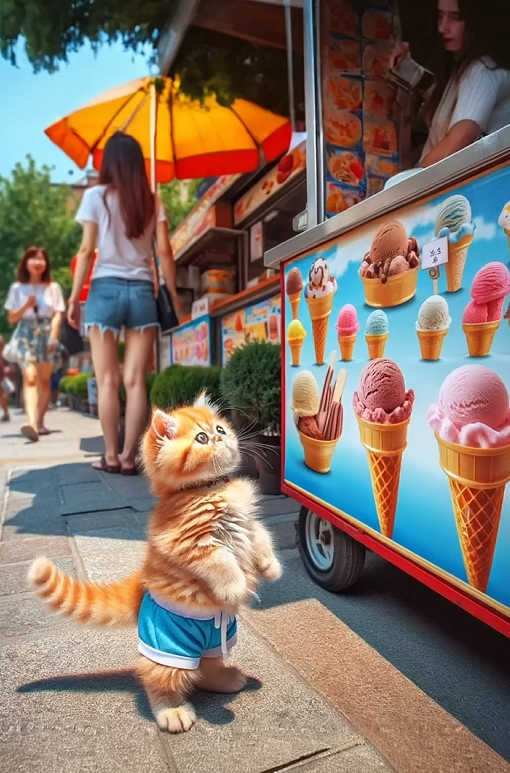 노란색 고양이가 아이스크림을 먹고싶은데 지갑을 열어보니 돈이 없는 모습을 그려줘