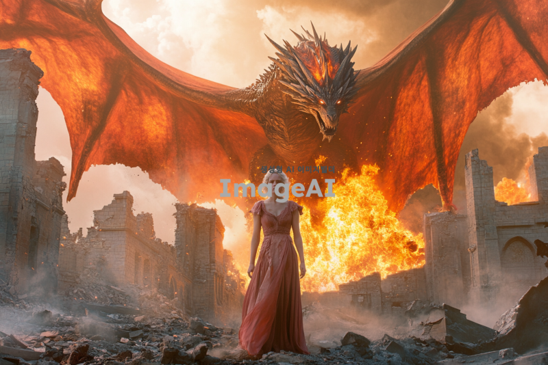 폐허가 된 왕국의 배경 속, 공주가 엉망이 된 드레스를 입고 슬퍼하는 모습. 공주 위에는 용이 왕자를 납치해 가는 장면이 보인다. 용은 거대한 날개를 펼치고 있으며, 불꽃이 입에서 뿜어져 나오는 모습. 공주의 얼굴에는 두려움과 슬픔이 가득하고, 주변에는 파괴된 성과 잔해들이 흩어져 있다. 어두운 하늘 아래, 긴장감 넘치는 순간을 포착한 이미지. 공주의 드레스는 잿더미의 일부가 된지 오래고, 흩날리는 먼지만이 그녀의 몸을 가려주고 있다.