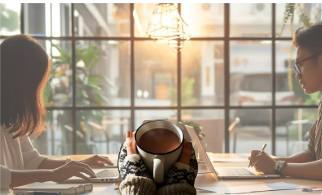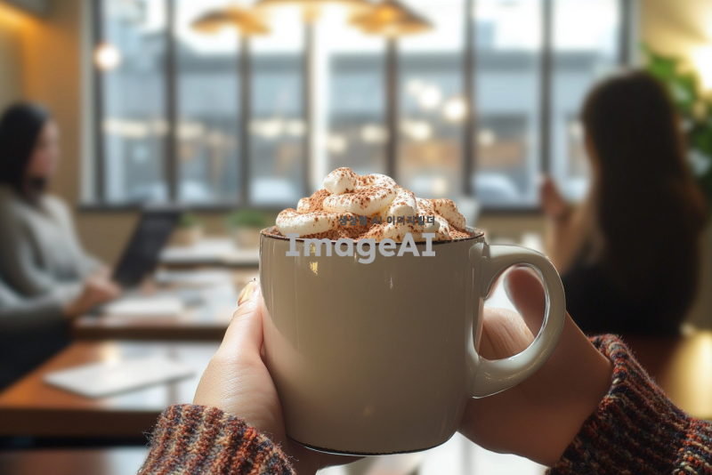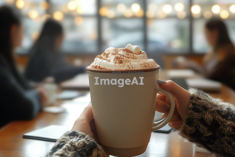 회의 전에 핫초코를 손에 들고 있는 모습이야 일인칭 시점으로 보여주고 장소는 회의실. 핫초코 안에 마시멜로우 토핑이 있었으면 해