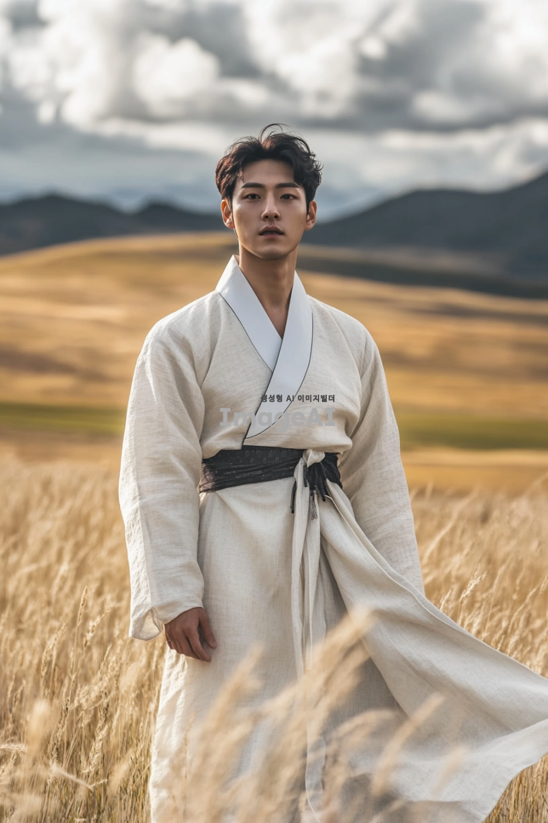 젊고 매력적인 20대 한국 남성이 한국의 전통 복식을 재해석한 옷을 입고, 산맥과 초원, 언덕, 광활한 평야의 아름다운 풍경을 배경으로 서 있는 모습. 남성의 표정은 자신감 넘치고 자연과 조화롭게 어우러지는 느낌을 주며, 바람에 흩날리는 옷자락과 함께 자연의 웅장함을 강조하는 장면.