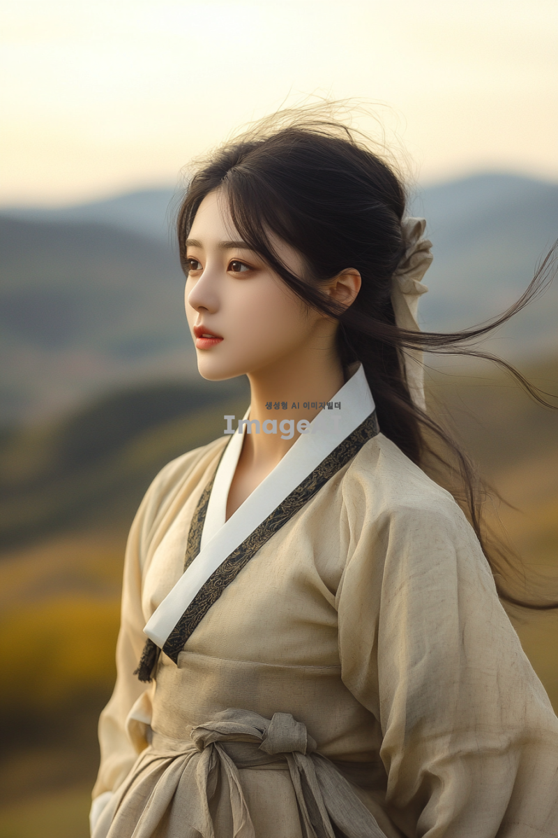 젊고 매력적인 20대 한국 여성이 한국의 전통적인 복식을 재해석한 옷을 입고, 산맥, 초원, 언덕, 광활한 평야의 아름다운 풍경을 배경으로 서 있는 모습. 여성의 표정은 자신감 넘치고 자연과 조화롭게 어우러지는 느낌을 주며, 바람에 흩날리는 옷자락과 함께 자연의 웅장함을 강조하는 장면.