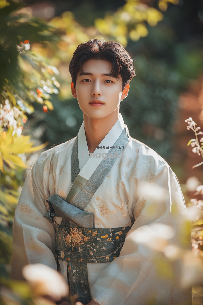 젊고 매력적인 20대 한국 남성이 전통적인 한국 복식을 현대적으로 재해석한 의상을 입고, 비옥한 농지와 풍요로운 정원을 배경으로 서 있는 모습. 그의 주변에는 푸른 식물과 다양한 꽃들이 만발해 있으며, 따뜻한 햇살이 비추어 생동감 넘치는 분위기를 자아낸다. 남성의 표정은 자신감 있고 행복해 보이며, 자연과 조화를 이루는 느낌을 강조한다.