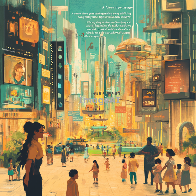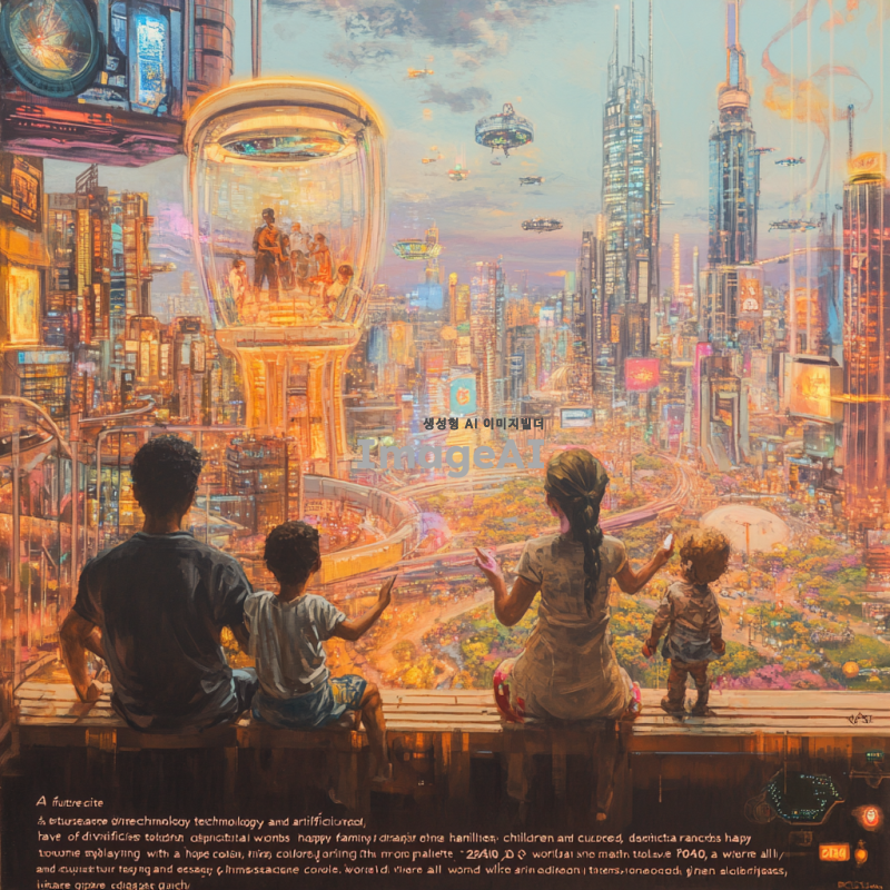 "미래의 도시 풍경, 유전자 편집 기술과 인공 자궁이 발전하여 행복한 가족들이 함께하는 모습, 다양한 인종과 문화가 어우러진 아이들이 뛰어노는 장면, 희망적이고 따뜻한 색감, '2040, 모든 생명이 가능해지는 세상'이라는 메시지"