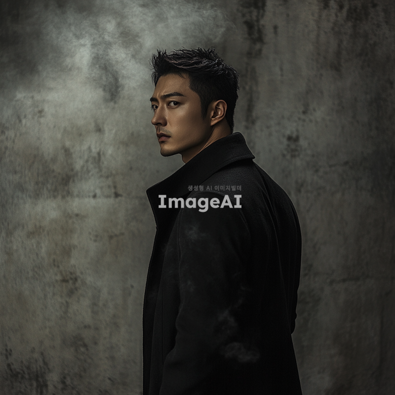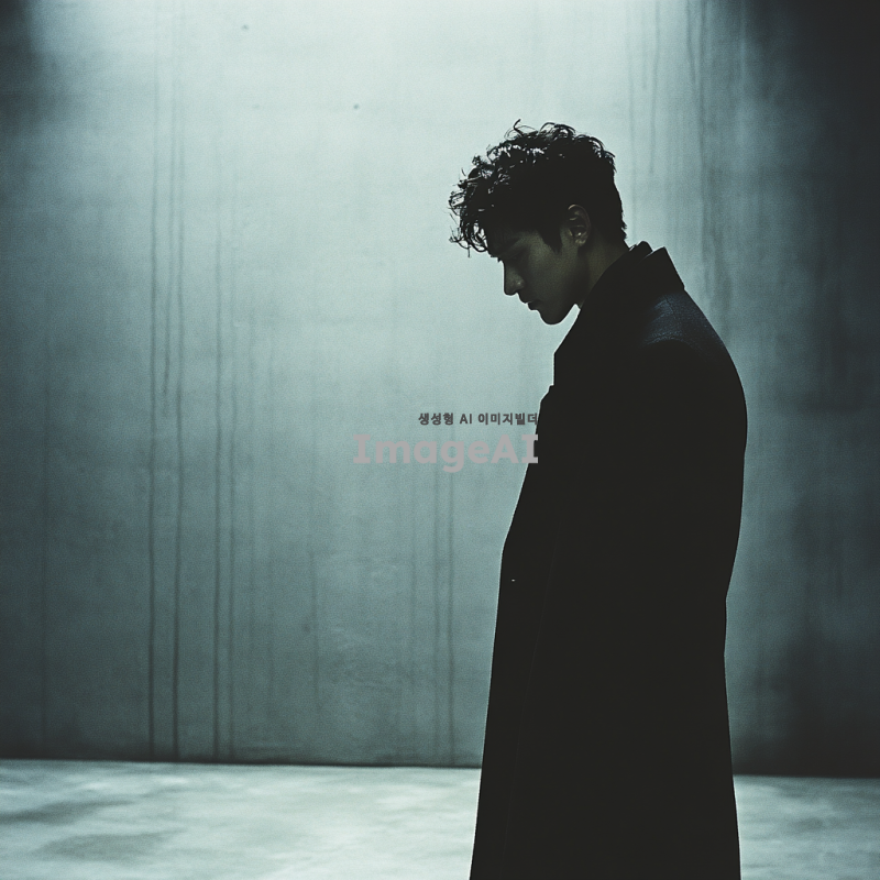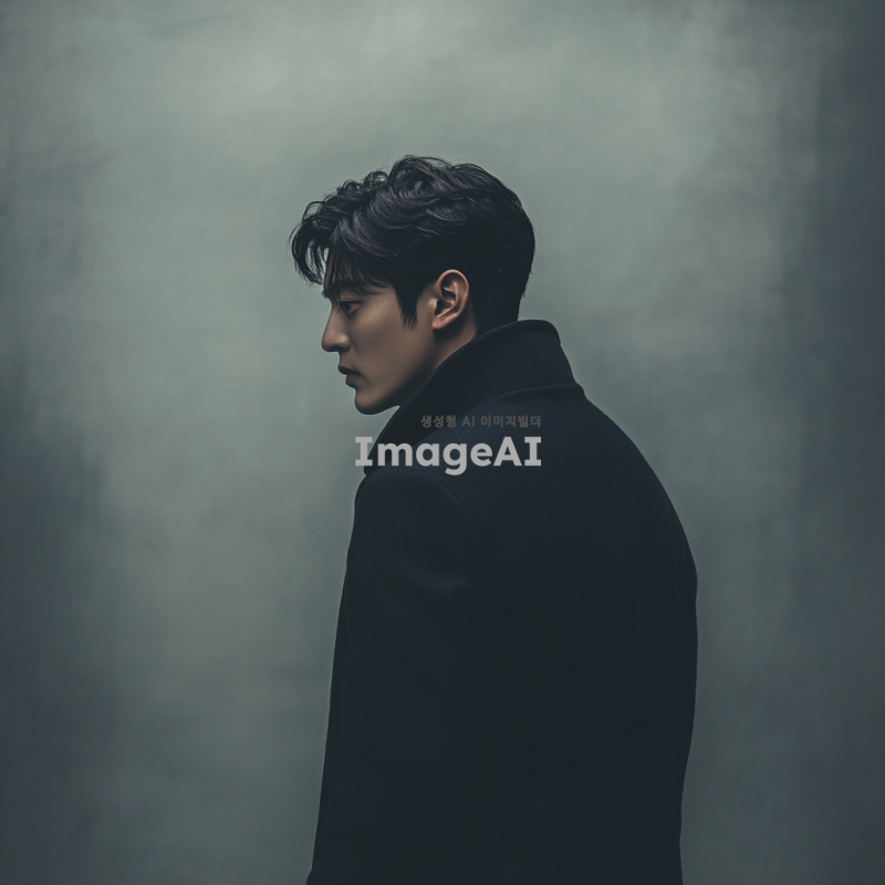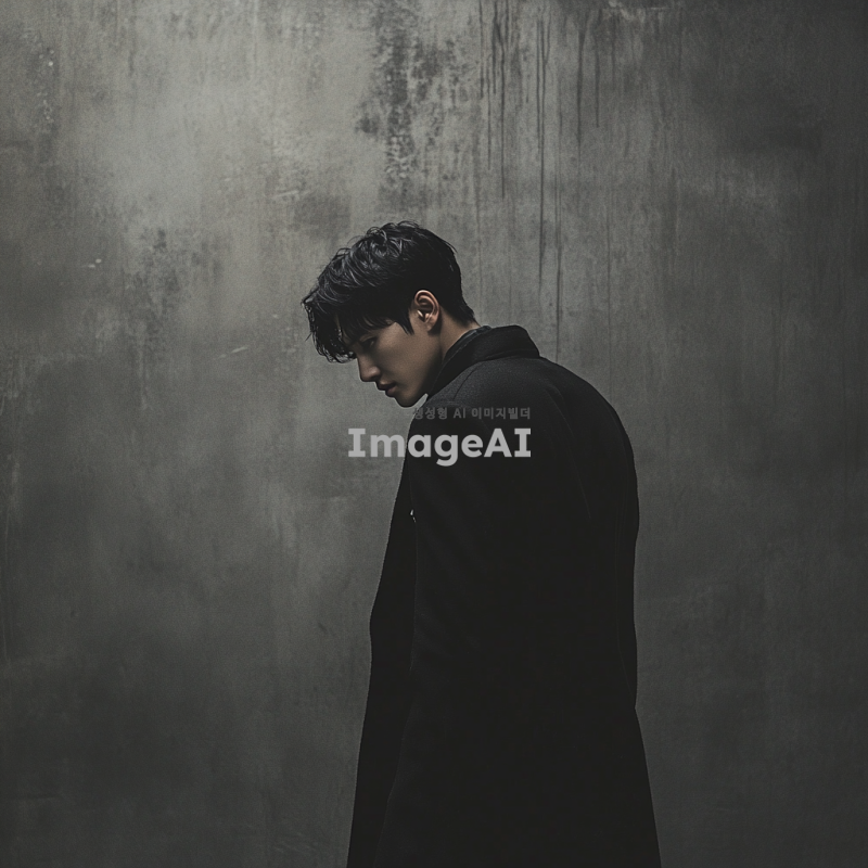 회색 방에서 검은색 코트를 입고 등을 돌리고 서 있는 한국인 남자의 모습, 신비로운 분위기, 낮은 조명, 그림자가 드리워진 배경, 긴장감 있는 포즈, 미스터리한 느낌 강조