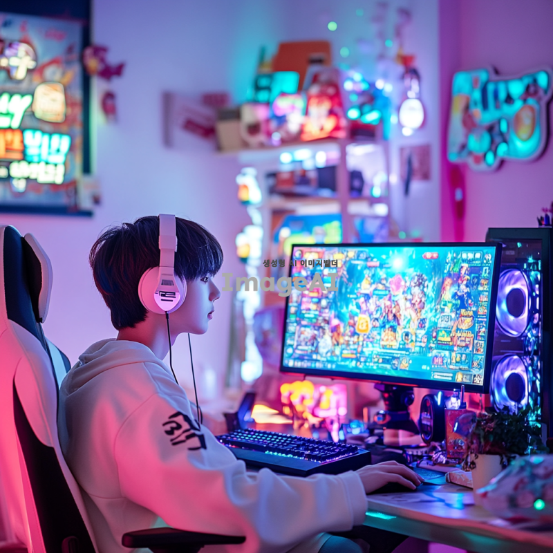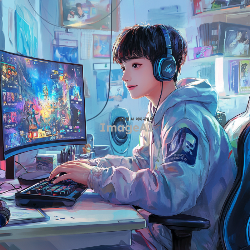 온라인 게임을 플레이하고 있는 10대 남자, 밝은 방 안에서 컴퓨터 앞에 앉아 집중하고 있는 모습, 화면에는 다양한 온라인 게임과 모바일 게임의 로고가 떠있음, 캐주얼한 옷을 입고 헤드셋을 착용하고 있으며, 주변에는 게임 관련 소품들이 놓여 있음, 활기찬 분위기, 한국의 젊은 남성의 특징을 잘 표현, 생동감 넘치는 색감