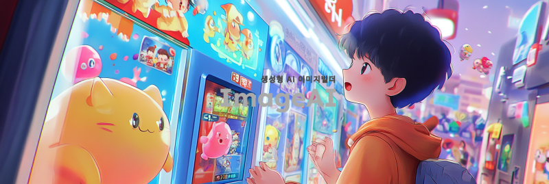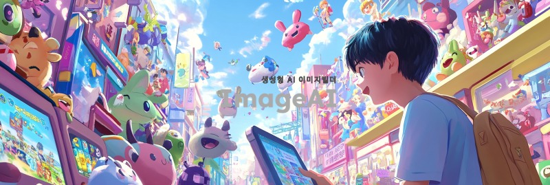 10대 한국 남자가 다양한 온라인 게임을 찾고 있는 장면을 귀여운 애니메이션 스타일로 표현. 배경은 아기자기한 게임 캐릭터와 아이템들로 가득 차 있으며, 남자는 신나는 표정으로 게임들을 바라보고 있다. 게임 캐릭터들이 주변에 흩어져 있어 활기찬 분위기를 연출하고, 색감은 밝고 경쾌하게 설정. 가로 1080px, 세로 340px 사이즈로 구성.