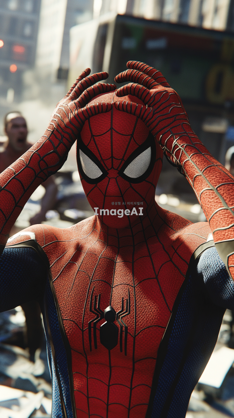 스파이더맨이 슈트를 입고 복면을 쓴 채로 양손을 머리에 얹고 당황 하고 있는 모습. 배경에는 사건이 발생한 듯한 혼란스러운 도시 풍경이 펼쳐져 있으며, 파편과 연기가 가득한 거리, 사람들의 놀란 표정이 보인다. 스파이더맨의 자세는 긴장감이 느껴지며, 주변의 긴박한 상황이 강조되어 있다.