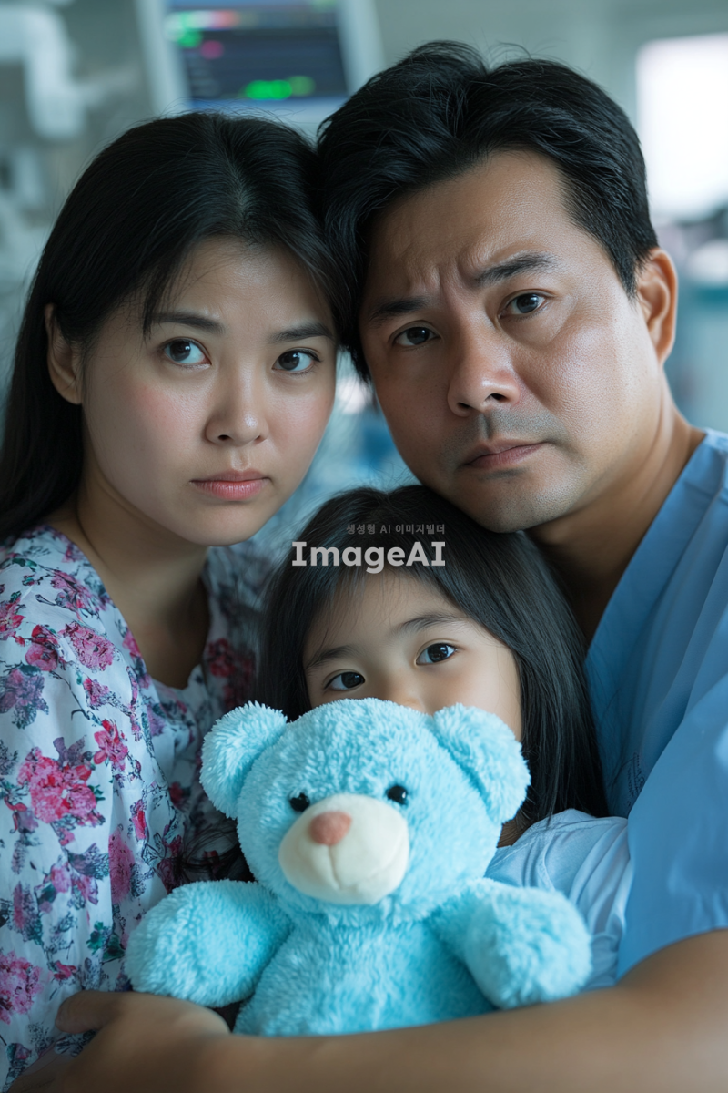 동양인 가족이 병원에서 찍은 가족사진. 엄마와 아빠는 걱정스러운 표정을 짓고 있으며, 여자아이는 환자복을 입고 하늘색 곰인형을 안고 있다. 전체적인 분위기는 공포스럽고 긴장감이 느껴지며, 배경에는 병원의 의료 장비와 차가운 조명이 어우러져 있다.