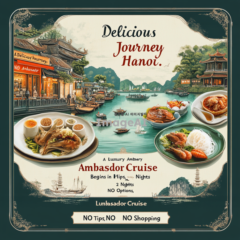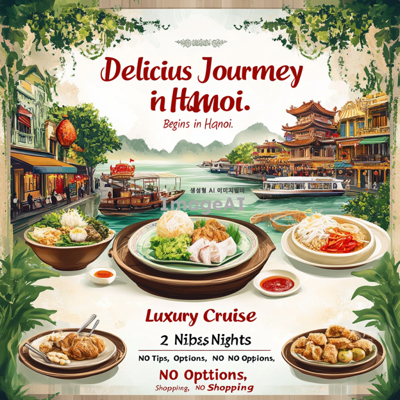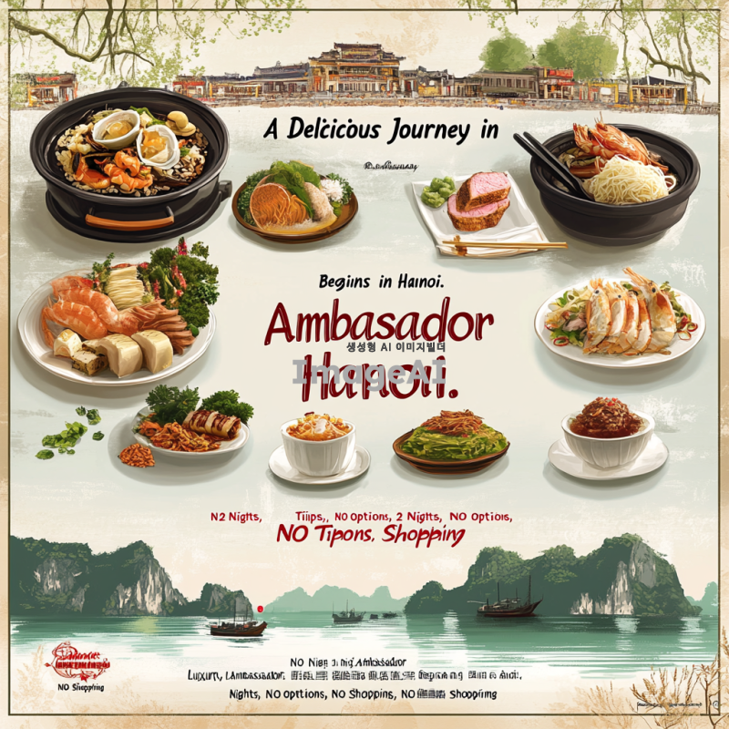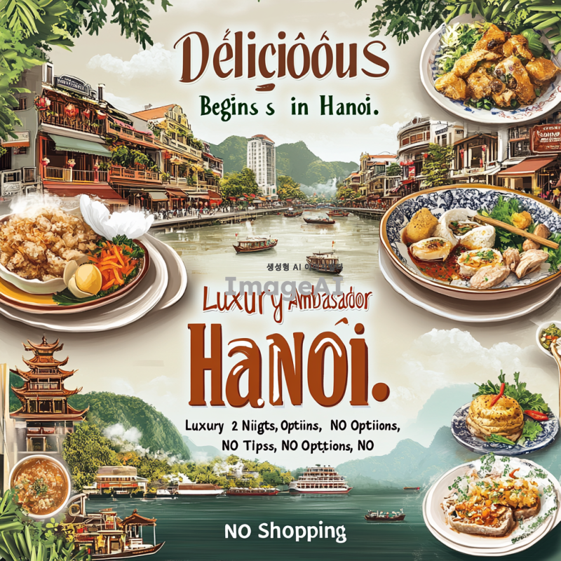 하노이의 매력을 담은 럭셔리 미식 여행 포스터 디자인. 배경에는 하노이의 전통적인 거리 풍경과 미슐랭 레스토랑의 고급스러운 모습이 조화를 이루고, 전면에는 "하노이에서 시작되는 맛있는 여행"이라는 문구를 강조. 길거리 음식의 소울과 미슐랭의 품격을 상징하는 다양한 음식 이미지가 배치되고, 란하베이의 에메랄드 빛 바다와 석회암 섬의 아름다움이 어우러진 풍경을 추가.