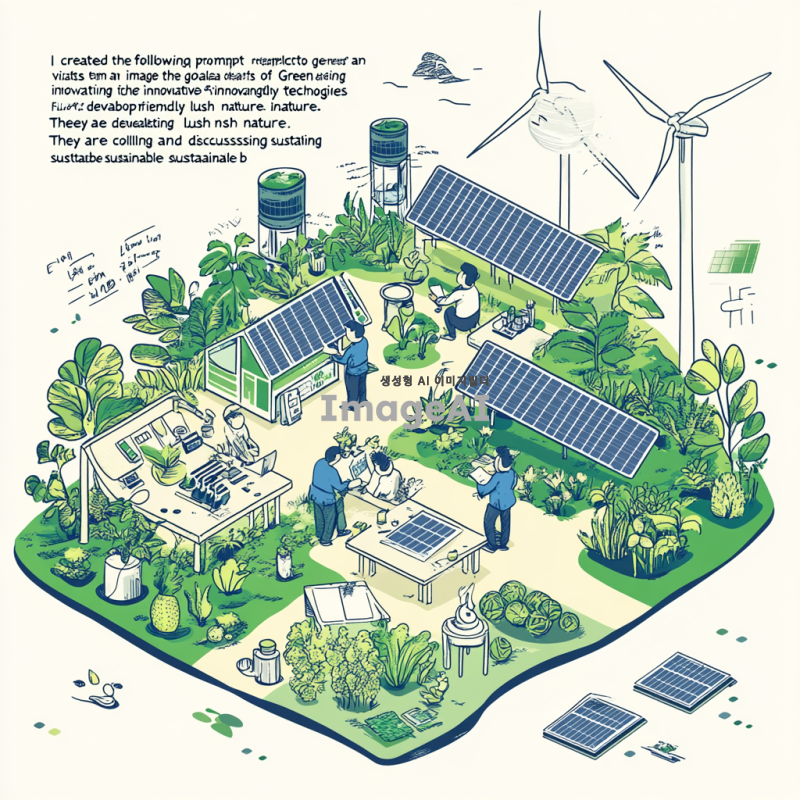 "푸른 자연 속에서 혁신적인 친환경 기술을 개발하는 한국의 스타트업 팀. 그들은 태양광 패널과 풍력 발전기를 배경으로, 지속 가능한 비즈니스 모델을 논의하며 서로 협력하고 있다. 주변에는 다양한 식물과 나무가 자생하고 있으며, 지역 주민들이 함께 참여하여 녹색 일자리를 창출하는 모습이 담겨 있다. 밝고 희망적인 분위기, 미래 지향적인 디자인, 탄소중립을 향한 열정이 느껴지는 장면."