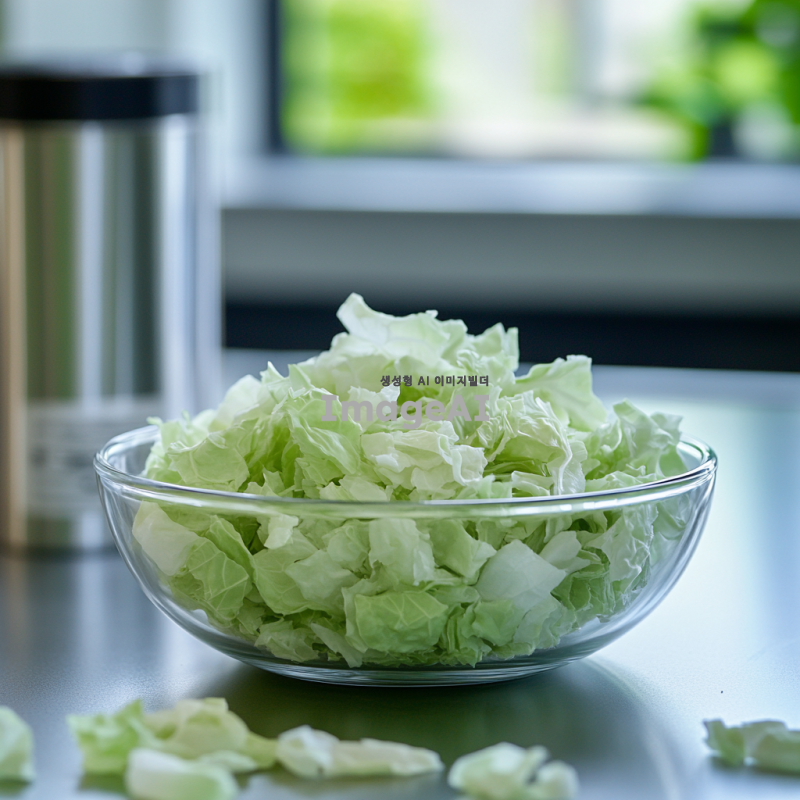 식품 실험을 위해 그릇에 담긴 동결건조된 배추의 이미지, 배경은 실험실 환경으로 설정, 깨끗하고 정돈된 느낌, 조명이 밝고 자연스럽게 비추는 모습, 배추의 질감과 색상이 잘 드러나도록 상세하게 표현.