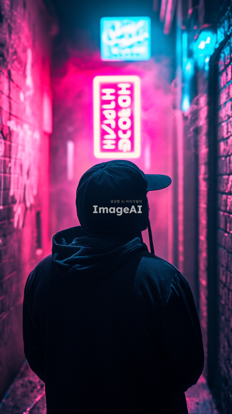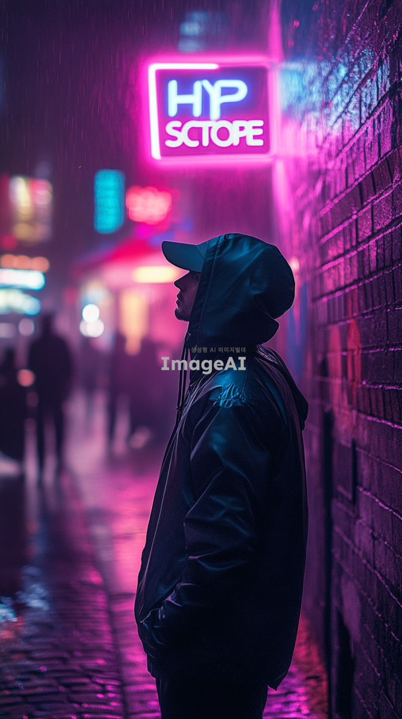 시네마틱, 어반 포토그래피, 어두운 후드를 입고 후드를 올리고 낮은 핏의 모자를 쓴 남자의 뒷모습, 고개를 약간 위로 기울이고 밝은 조명의 포스터를 향해 'Hypstore'라고 적힌 게시판을 향해 중심을 잡았습니다. 밤에 좁은 도심 골목길에 가만히 서 있는 자세, 깨끗하고 미니멀한 미학이 돋보이는 모던 캐주얼 스트리트웨어, (2025), 미디엄 샷이 상반신과 머리를 선명한 초점으로 포착, 생생한 색감과 은은한 질감의 코닥 에카크롬 필름 스톡, 시네마틱 보케를 위한 50mm f/1.2 렌즈의 캐논 EOS R5, (크리스토퍼 놀란에서 영감을 받은 분위기 프레임), 호기심과 조용한 사색의 감정, 젖은 포장도로와 후드의 가장자리를 반사하는 핑크, 블루, 보라색 색조의 네온 조명, 빛나는 하이라이트가 있는 균형 잡힌 생동감 넘치는 컬러 팔레트, 그라피티가 있는 벽돌 벽, 공중에 남아 있는 희미한 안개, 희미하게 빛나는 거리 표지판과 젖은 자갈 바닥처럼 흩어진 디테일이 특징입니다. 빛나는 'Hypestore' 게시판은 부드러운 시네마틱 빛이 주변을 비추는 초점으로 두드러지게 배치되어 남자의 시선을 사로잡았습니다.