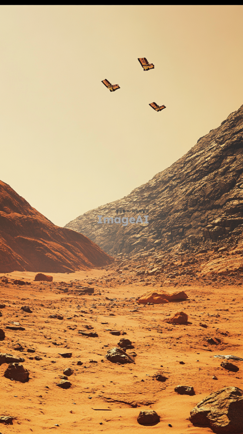 화성의 붉은 풍경 속에 태극기가 휘날리고 있는 모습, 태극기의 색깔과 문양이 선명하게 드러나며, 화성의 특유의 바위와 모래가 배경을 이루는 장면, 맑은 하늘 아래 태극기가 자랑스럽게 서 있는 모습.