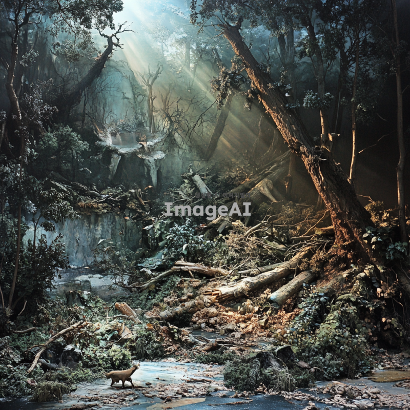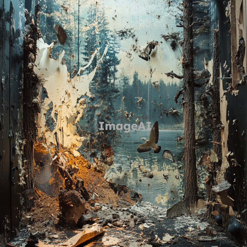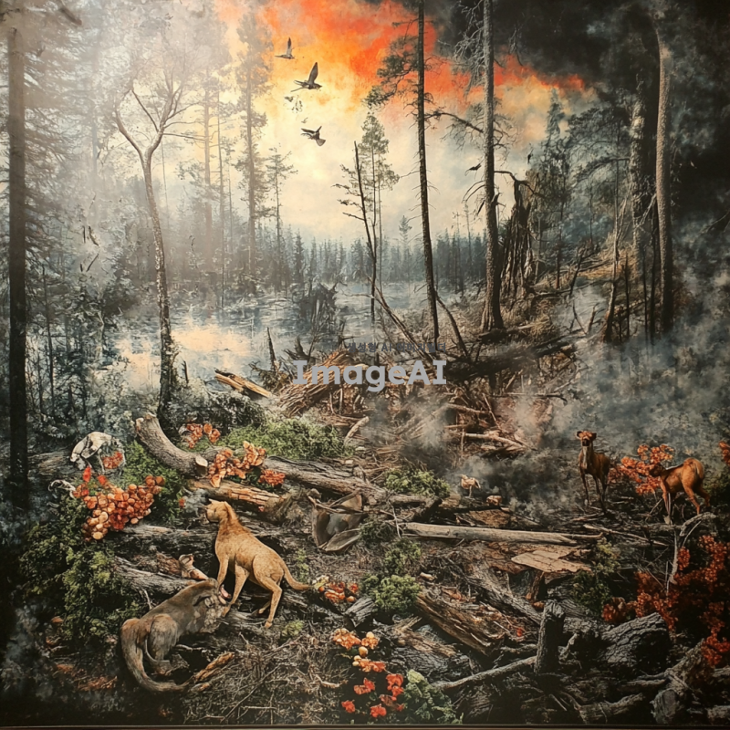 위기의 숲을 주제로 한 설치 미술을 표현한 이미지, 고요한 숲 속에서 나무들이 베어지고, 동물들이 도망치는 장면, 파괴된 생태계를 강조하는 음향 효과를 상상하게 만드는 요소들, 잔해와 함께 남겨진 자연의 아름다움, 어두운 색조와 대비되는 빛의 효과로 긴장감을 주는 구성.