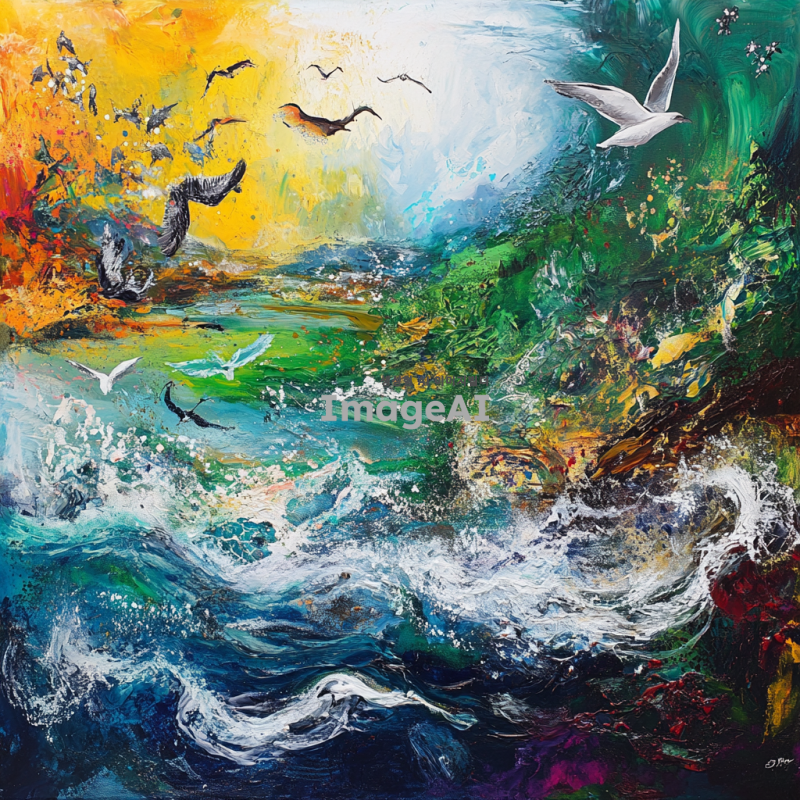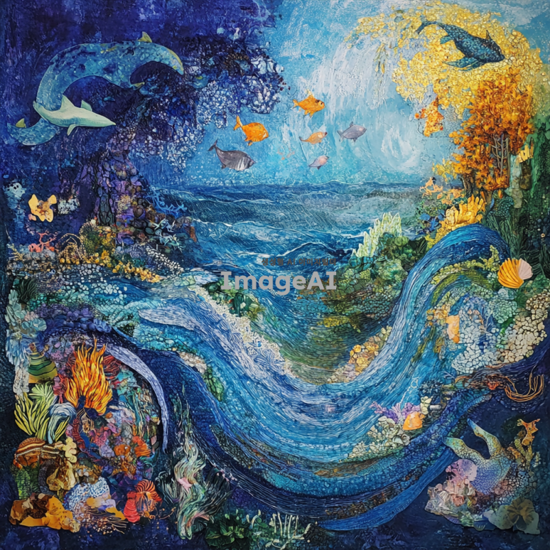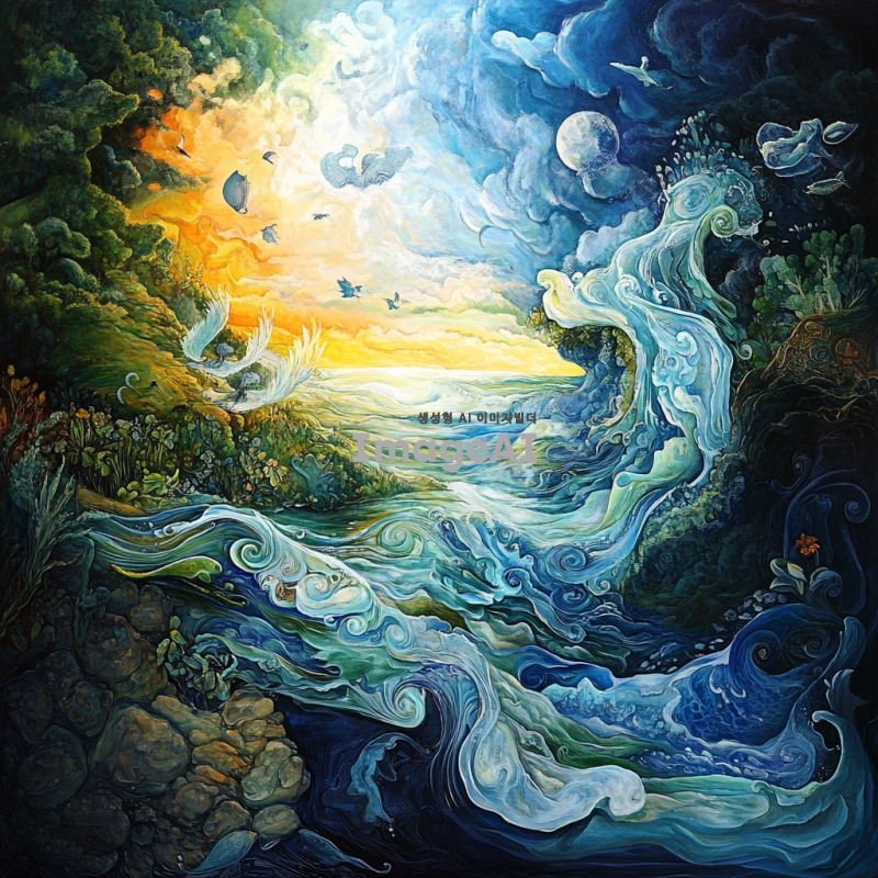 생명의 파동을 주제로 한 미디어 아트, 강과 바다, 공기 속 생명체의 연결성을 형상화한 이미지. 다양한 생명체들이 조화롭게 어우러져 있는 장면, 생명의 소리가 공간을 가득 채우는 느낌을 전달하는 풍경. 자연의 아름다움과 생명력 넘치는 요소들이 함께하는 장면. 강물의 흐름, 바다의 파도, 공기의 움직임이 서로 연결되어 있는 모습, 색감과 형태로 생명의 에너지를 표현한 장면.