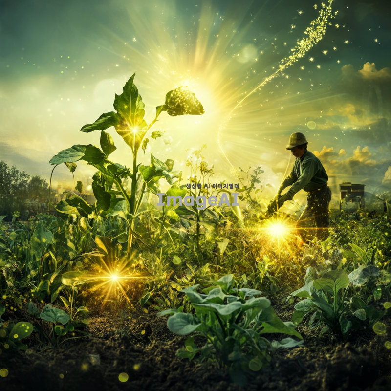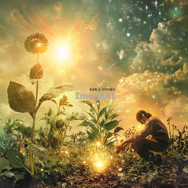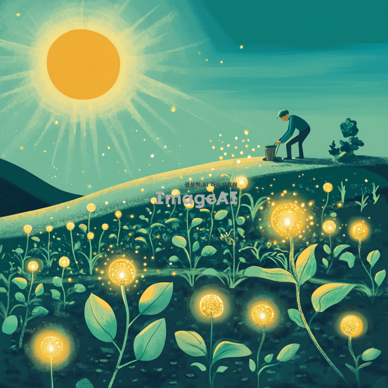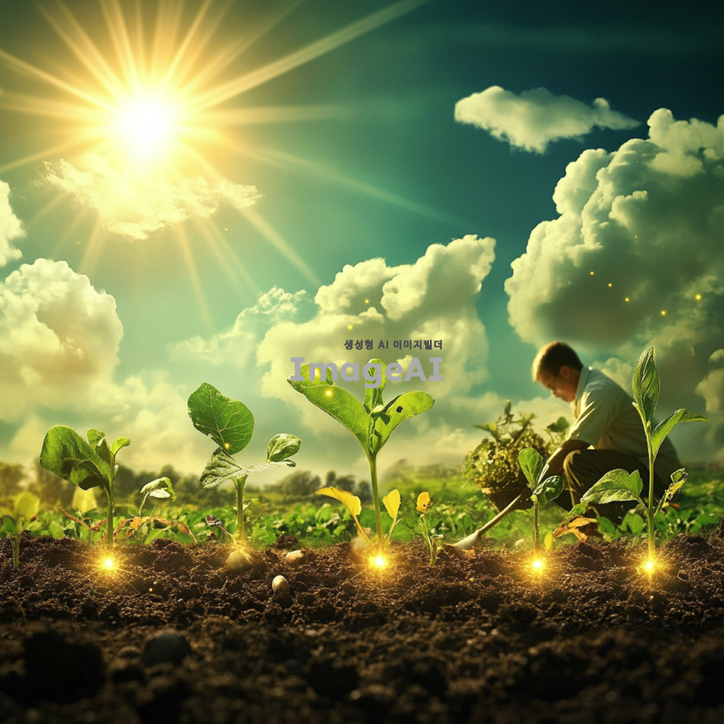 미래의 씨앗을 주제로 한 이미지, 푸른 들판에 다양한 식물들이 자생하는 모습, 하늘에는 밝은 태양이 떠 있고, 식물들은 빛나는 씨앗을 품고 있으며, 씨앗에서 나오는 빛이 주변을 환하게 비추는 장면, 평화롭고 희망적인 분위기, 농부가 씨앗을 심고 있는 모습