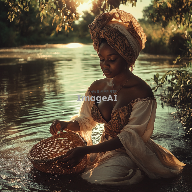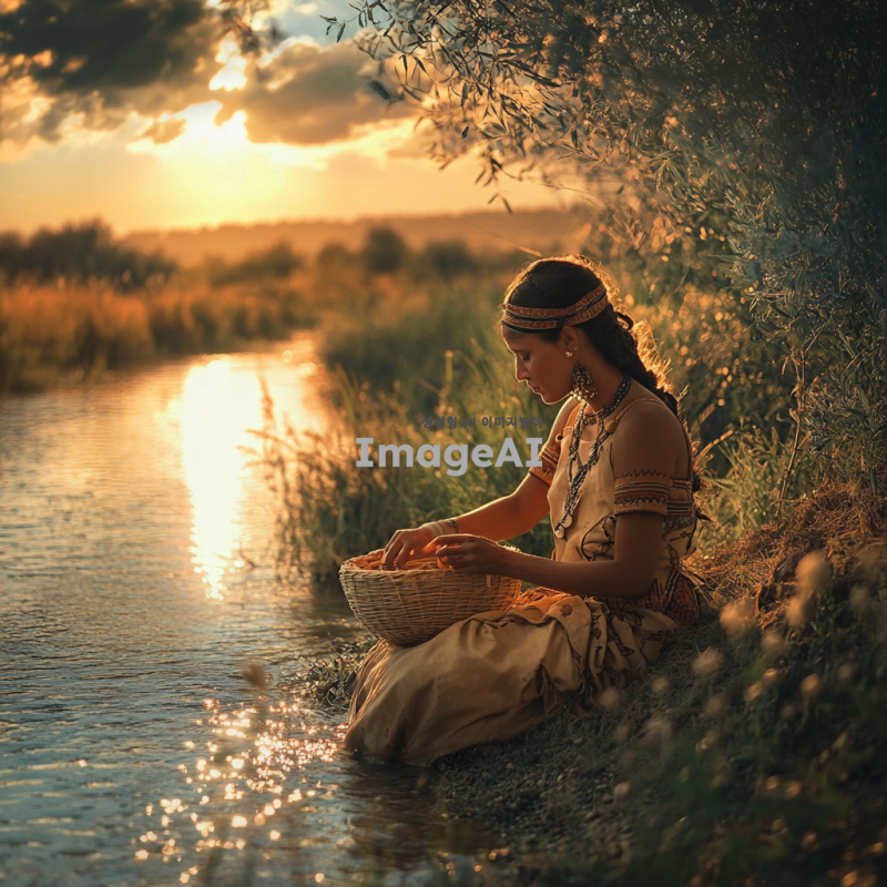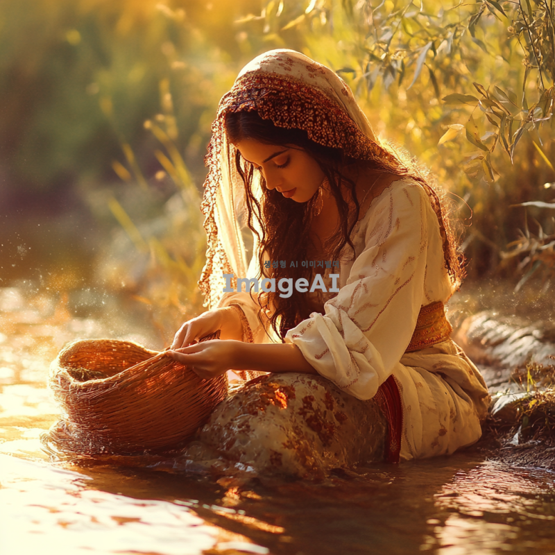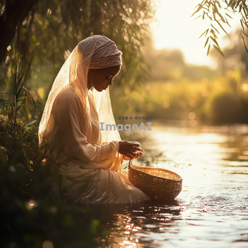 아기 모세의 어머니가 강가에서 바구니를 만드는 모습, 전통적인 의상을 입고, 자연의 아름다움 속에서 집중하는 표정, 따뜻한 햇살이 비추는 배경, 부드러운 색감, 감동적인 분위기