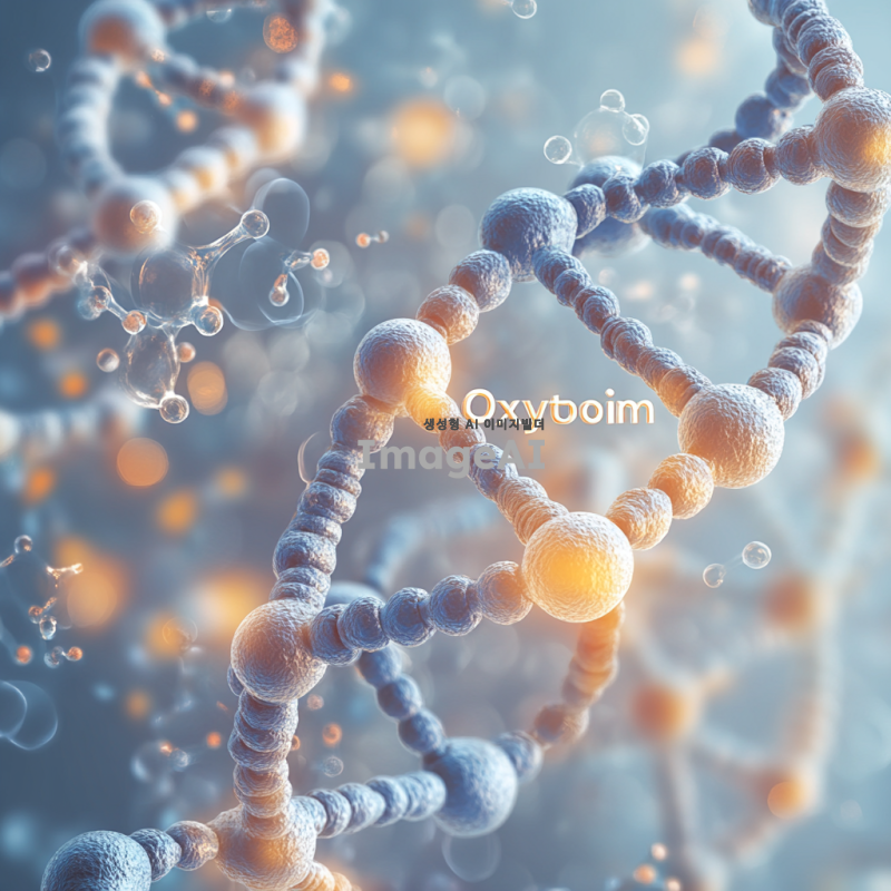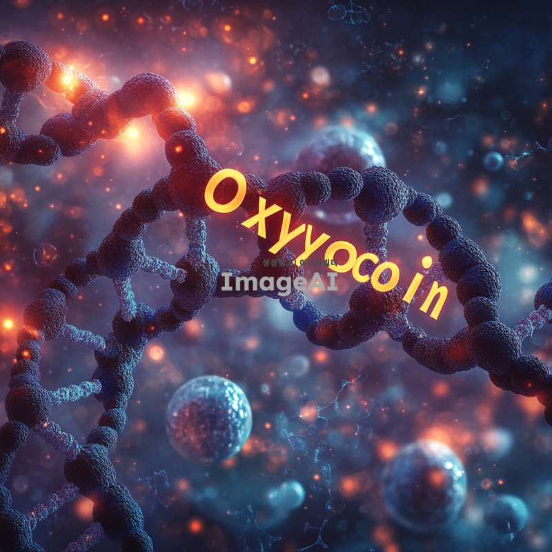 옥시토신 호르몬의 구조와 기능을 시각적으로 표현한 그림, 중앙에 '옥시토신'이라는 글자가 크게 보이도록 배치, 부드러운 색조와 따뜻한 느낌을 주는 배경, 호르몬의 이중 나선 구조와 함께 관련된 생물학적 요소들(예: 세포, 신경전달물질 등)도 포함하여 과학적이고 교육적인 분위기를 강조한 이미지.