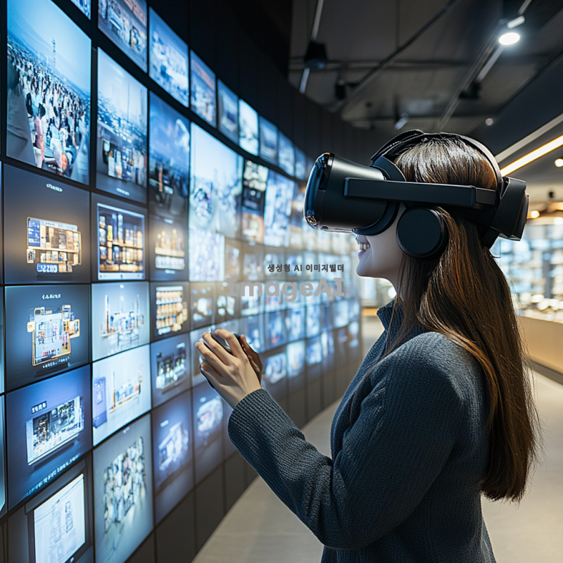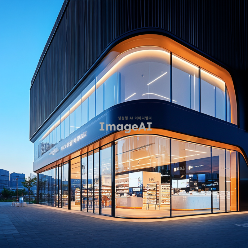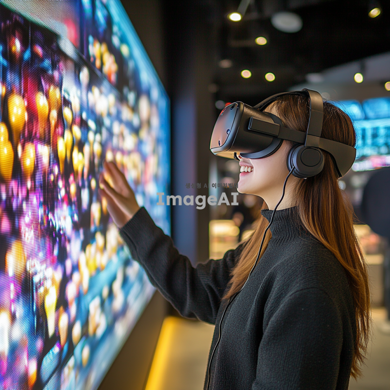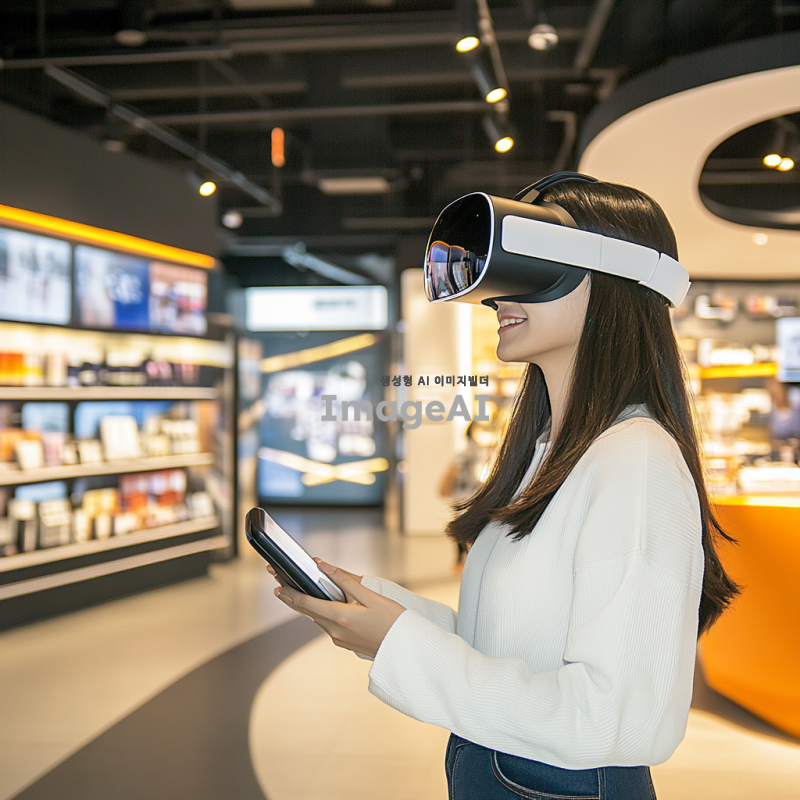 한국의 현대적인 VR 쇼핑 회사 본사, 최신 기술을 활용한 혁신적인 쇼핑 경험, 고객들이 가상 현실에서 즐겁게 쇼핑하는 모습, 세련된 인테리어와 밝은 조명, 다양한 상품들이 진열된 가상 매장, 행복한 고객들의 표정, 성공적인 기업의 분위기, 미래지향적인 디자인, 디지털 인터페이스와 상호작용하는 모습, 동적인 비즈니스 환경. VR회사 건물 외관