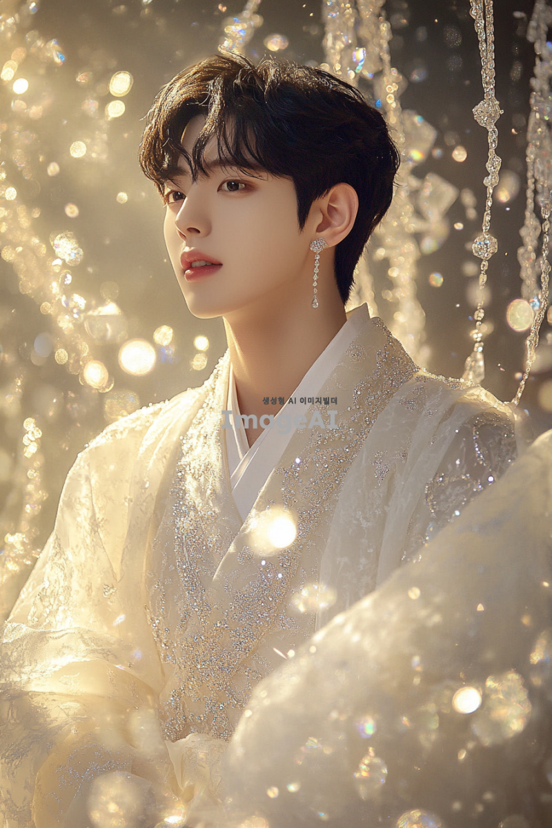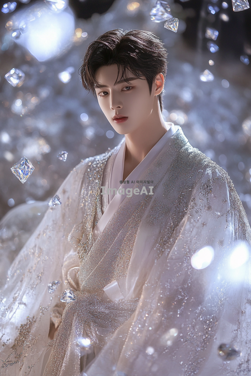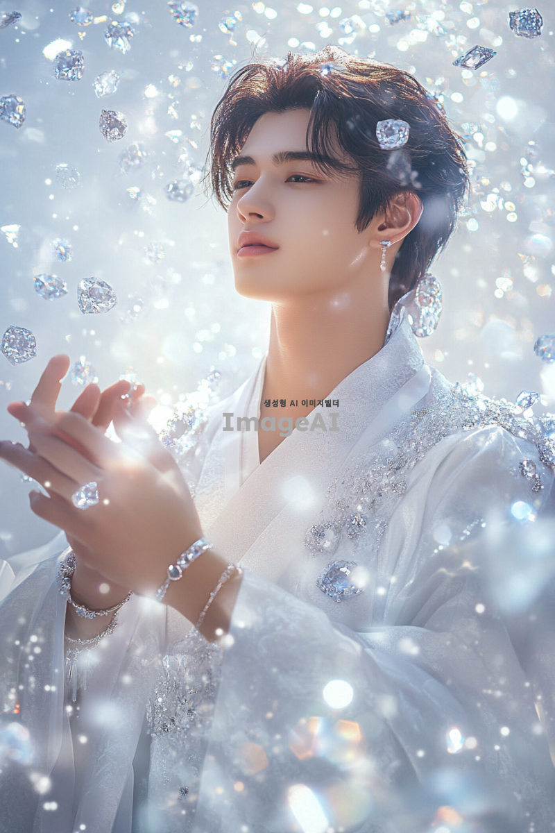 다이아몬드와 장신구를 의인화한 20대 젊고 매력적인 남성이 하얀 한복을 입고 서 있는 모습. 그의 몸에서 빛나는 다이아몬드와 장신구가 반짝이며, 우아하고 고귀한 분위기를 자아낸다. 배경은 반짝이는 다이아몬드들이 반짝이는 풍경으로 인물과 조화를 이루고 있다.