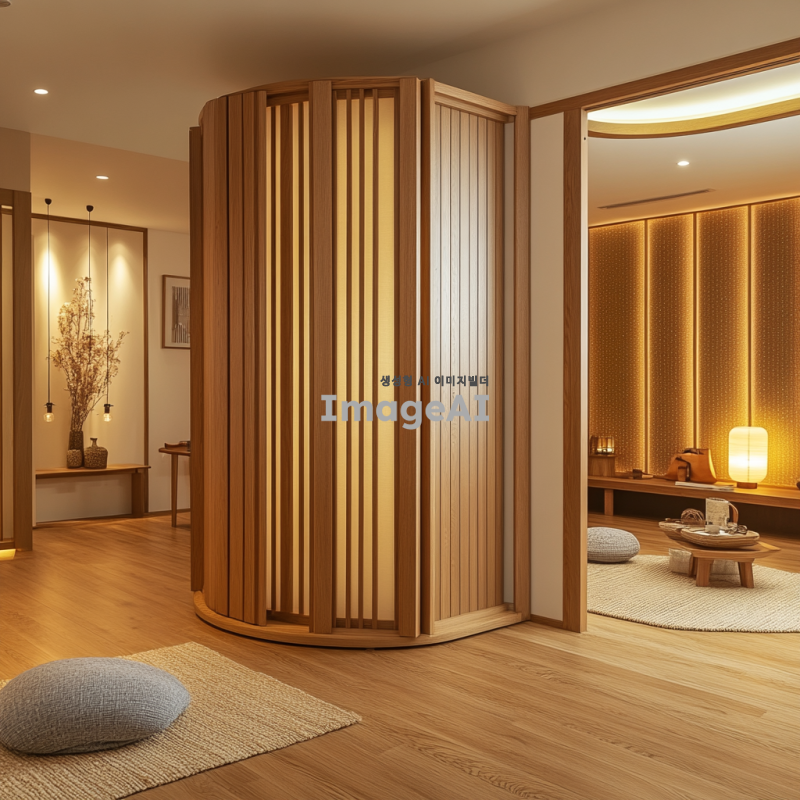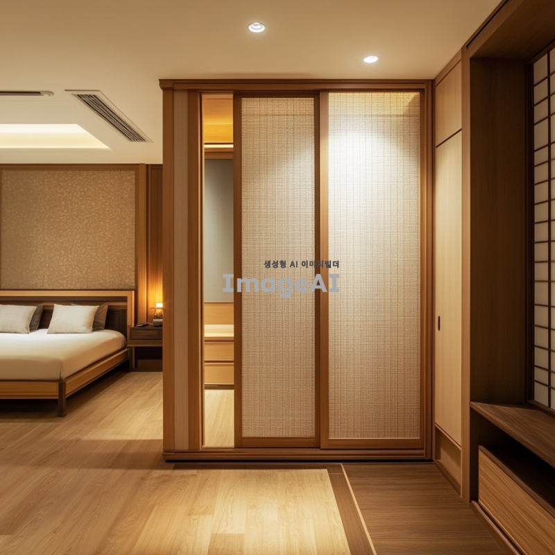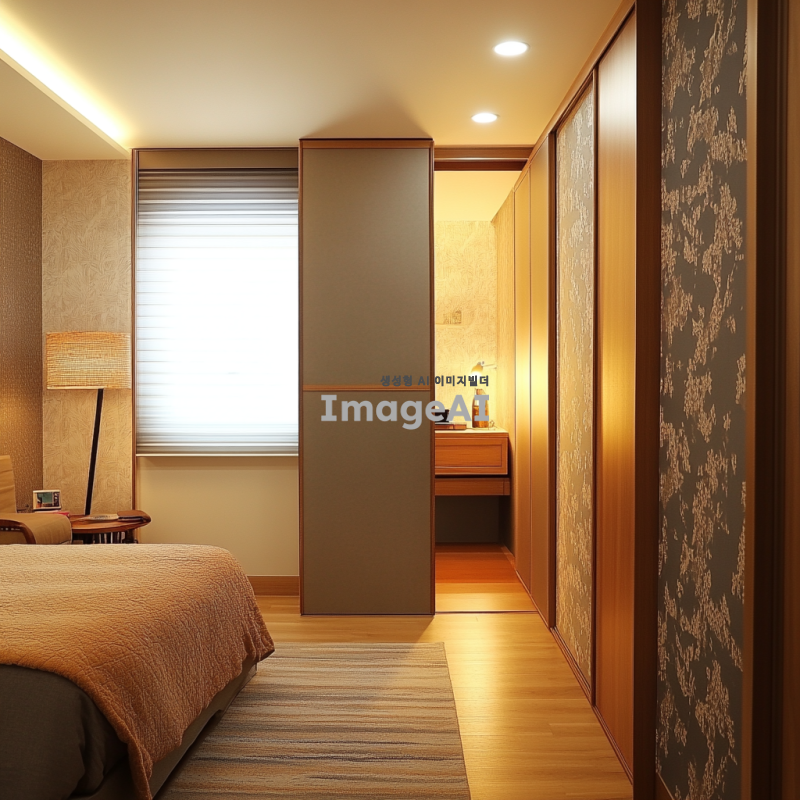 한국의 현대적인 방 안, 양쪽에 문이 있는 분박이장이 중앙에 배치되어 있고, 한쪽 문은 수직으로 여는 형태로 디자인되어 있는 모습. 방은 아늑한 조명과 함께 따뜻한 색감의 벽지로 꾸며져 있으며, 바닥은 나무재질로 되어 있다. 방의 다른 가구는 간결하고 세련된 스타일로 배치되어 있어 편안한 분위기를 연출하고 있다.