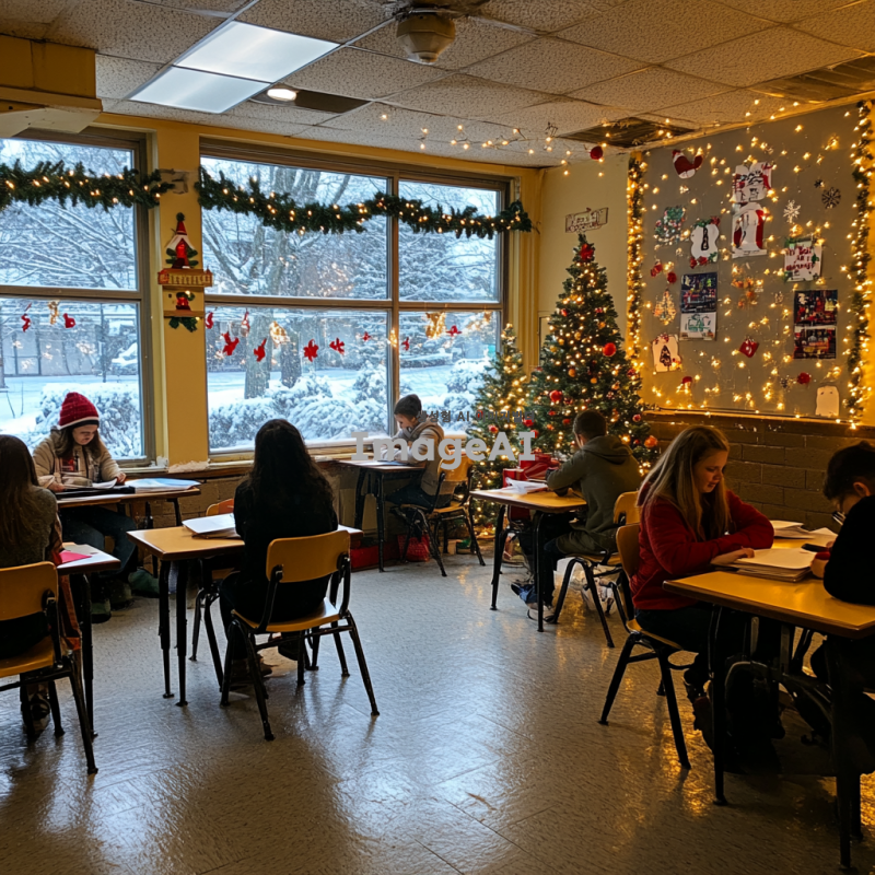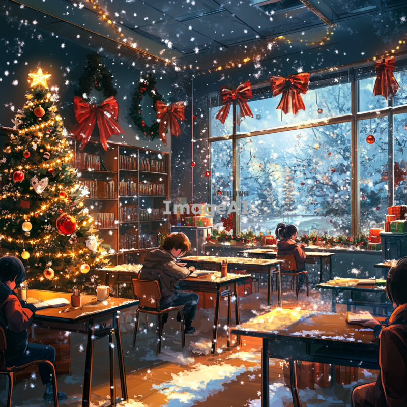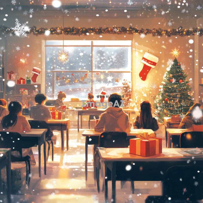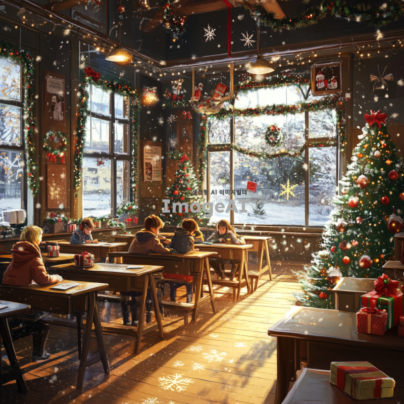 크리스마스 분위기로 꾸며진 교실 내부, 아기자기한 크리스마스 장식과 조명, 따뜻한 느낌의 조명 아래 학생들이 즐겁게 공부하는 모습, 벽에는 크리스마스 트리와 선물들이 놓여 있고, 창문에는 눈송이가 내리는 풍경, 전체적으로 화사하고 따뜻한 색감의 이미지, 교실책상은 여러개가 보이도록 이미지를 만들어줘