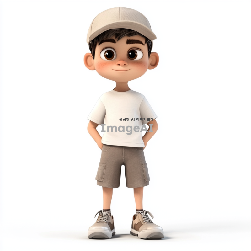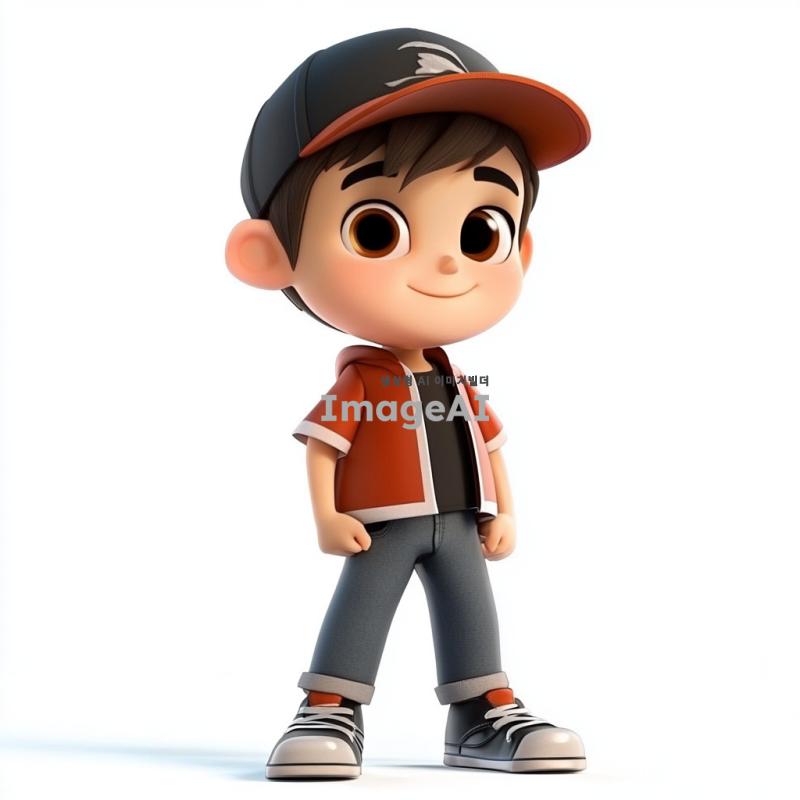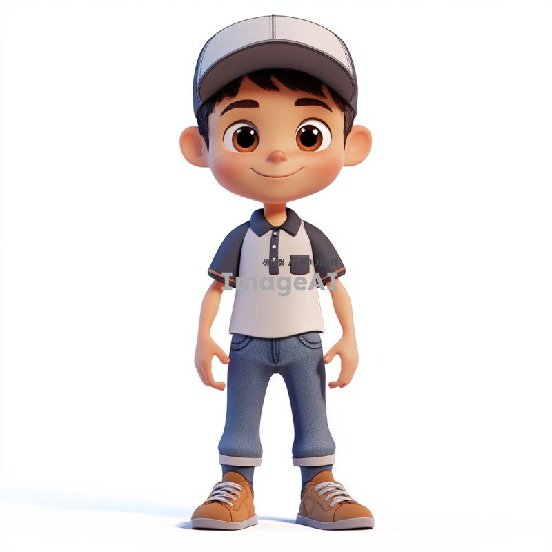 미소년이 야구 모자를 쓰고 구두를 신은 모습, 3D 마야 처럼 각이 져있게 , 무표정으로 서 있는 모습, 배경은 없음.