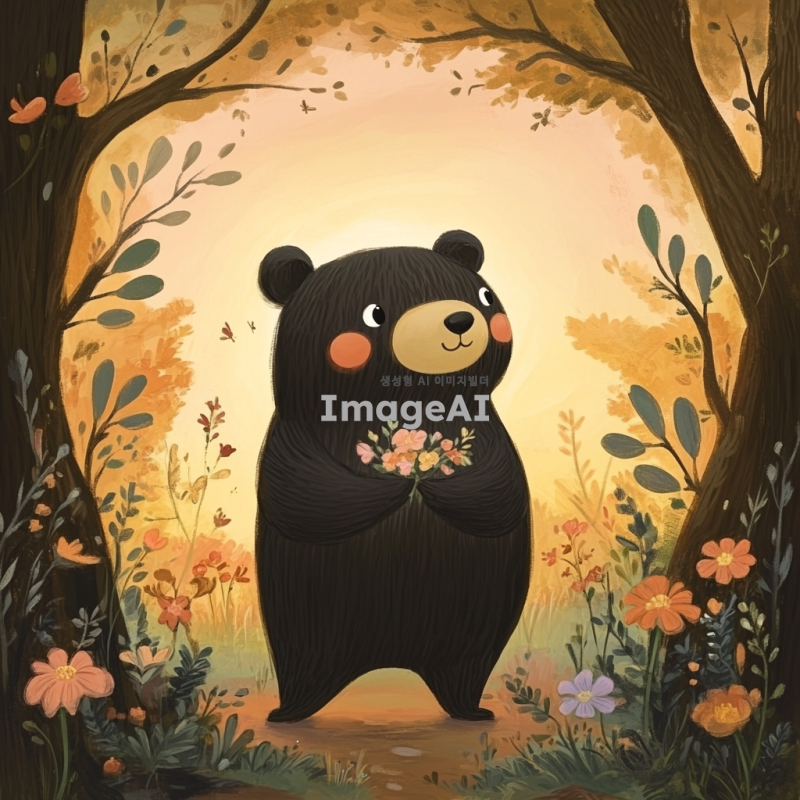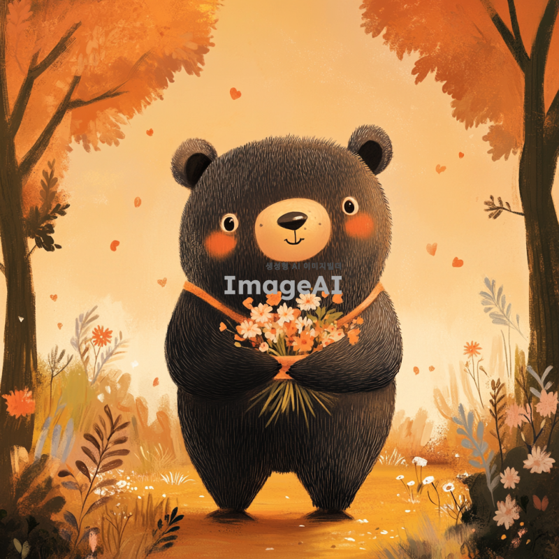 데이트하러 가는 흑곰, 사랑스러운 모습, 귀여운 액세서리 착용, 자연 속에서 즐거운 표정, 따뜻한 색감의 배경, 부드러운 빛이 비치는 저녁 시간, 로맨틱한 분위기, 주변에 꽃과 나무가 있는 풍경