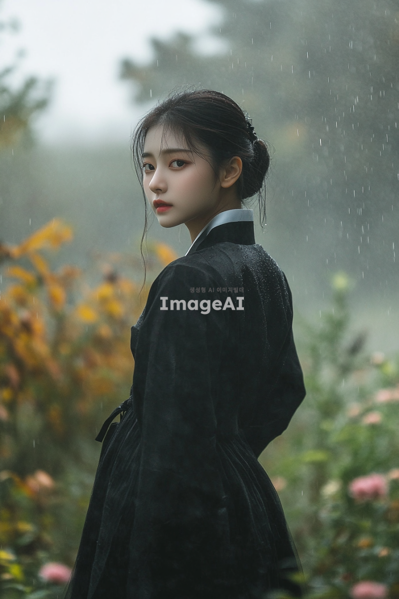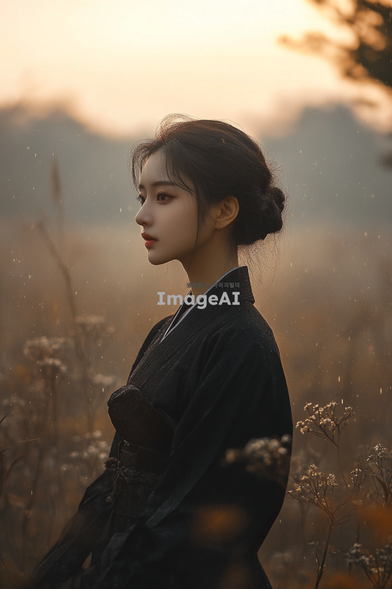 가랑비와 안개가 낀 새벽, 이슬이 맺힌 아름다운 풍경 속에 서 있는 20대 젊고 매력적인 한국 여성. 그녀는 우아한 검은 한복을 입고 있으며, 자연과 조화를 이루는 모습으로 의인화되어 있다. 부드러운 빛이 그녀의 주위를 감싸고, 신비로운 분위기를 자아내고 있다.
