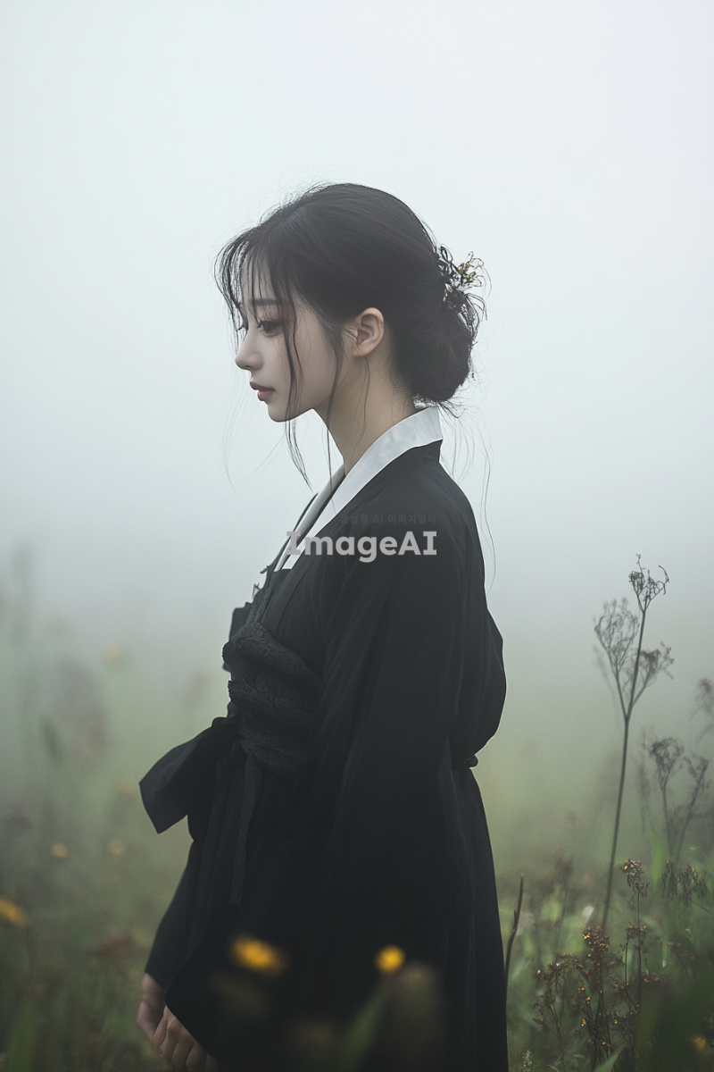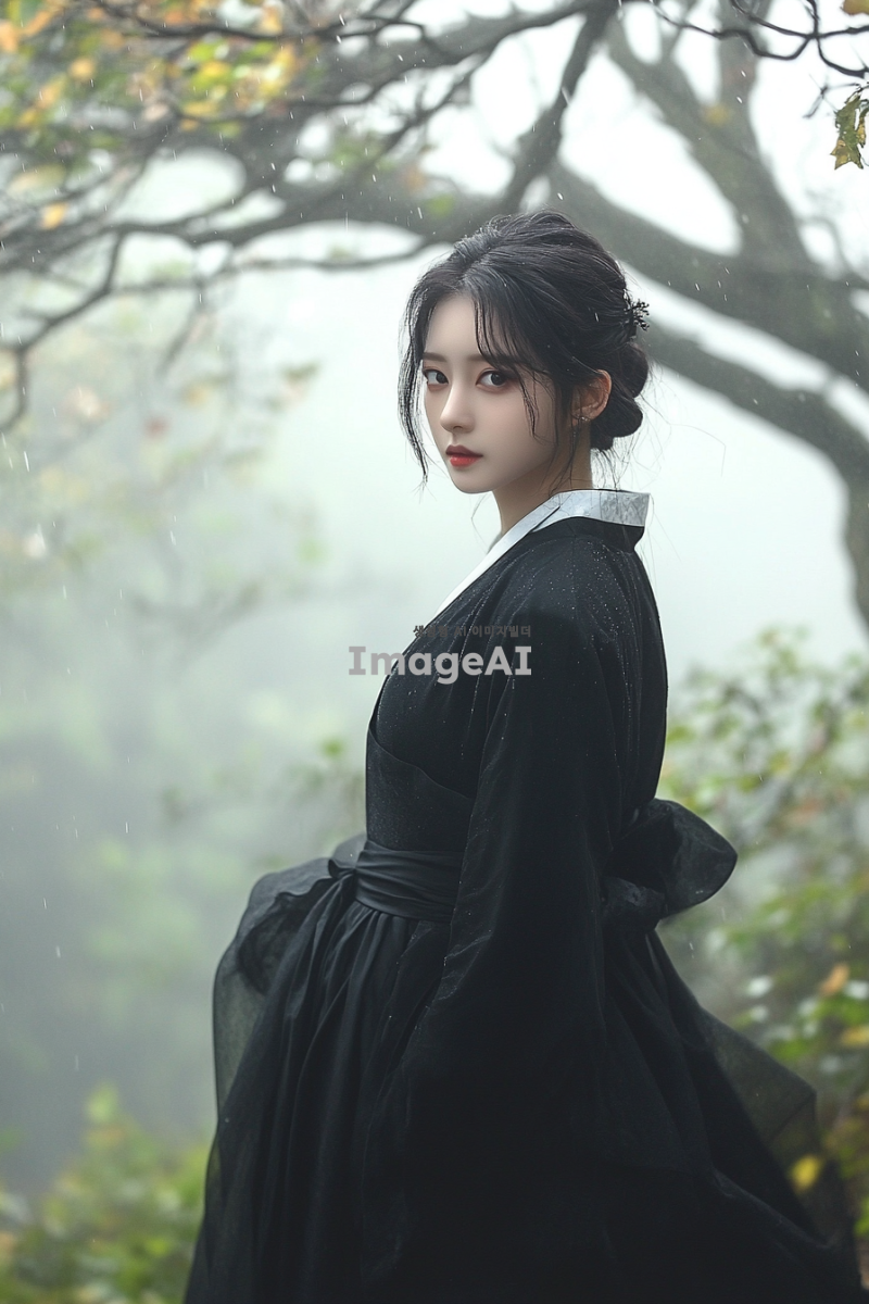 가랑비, 안개, 새벽의 이슬이 형상화, 의인화된 20대 젊고 매력적인 한국 여성. 검은 한복을 입고있다.