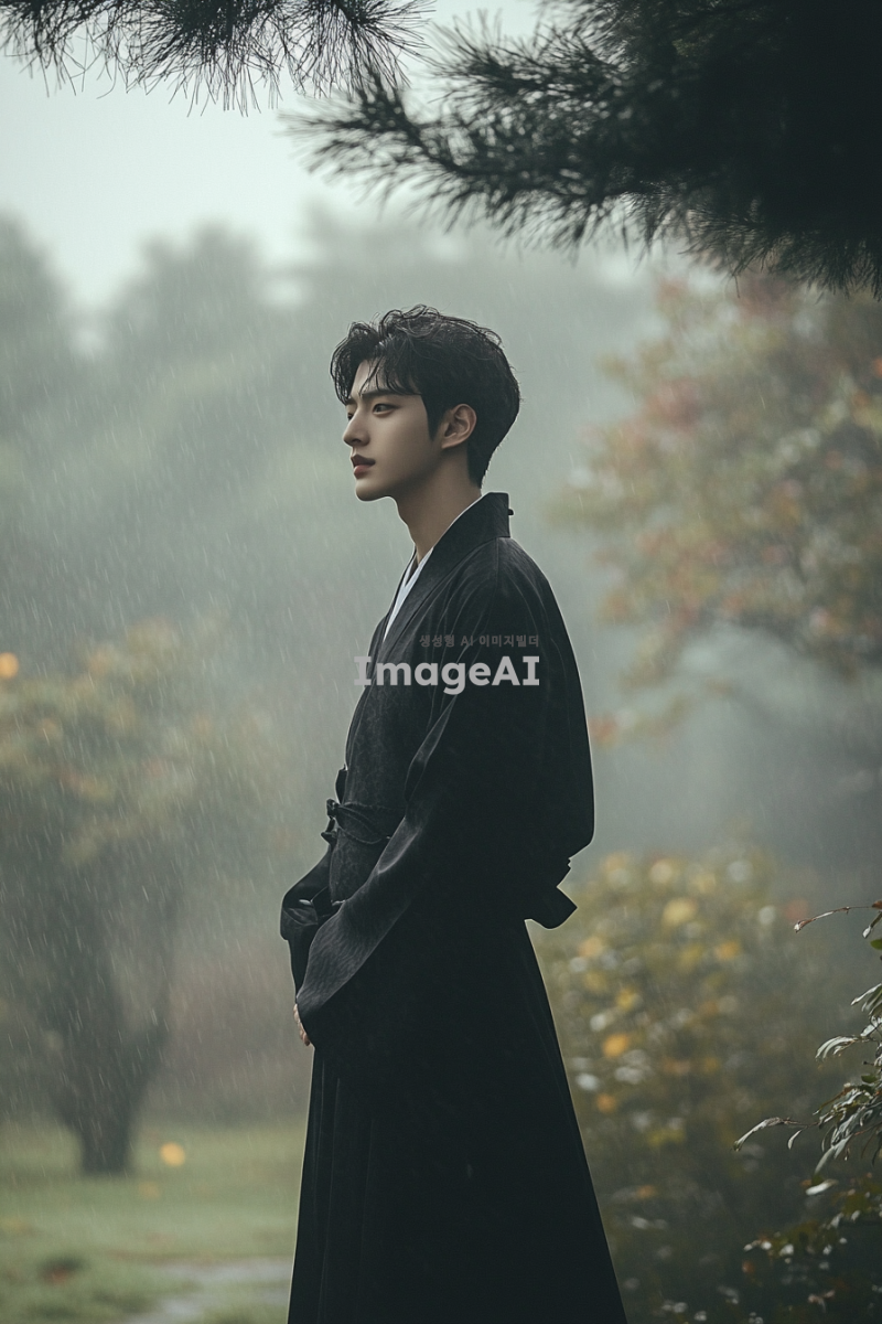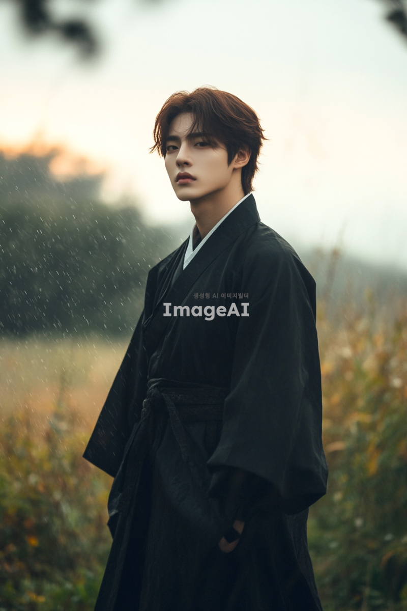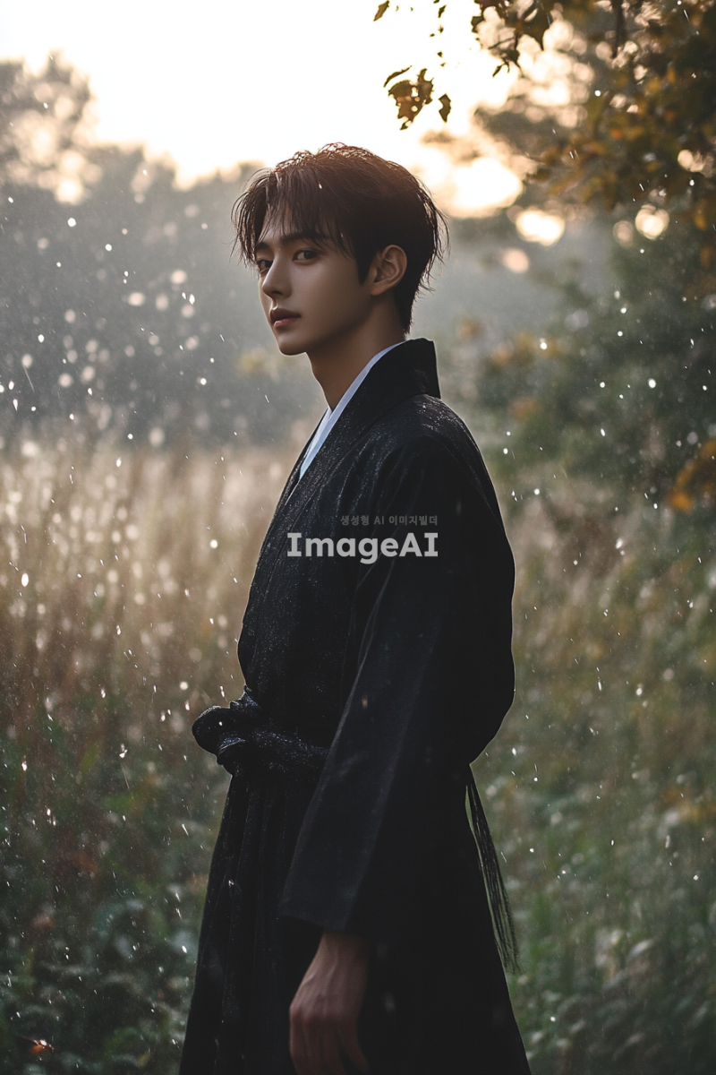 가랑비와 안개가 낀 새벽, 이슬이 맺힌 아름다운 풍경 속에 서 있는 20대 젊고 매력적인 한국 남성. 그는 우아한 검은 한복을 입고 있으며, 자연과 조화를 이루는 모습으로 의인화되어 있다. 부드러운 빛이 그의 주위를 감싸고, 신비로운 분위기를 자아내고 있다.