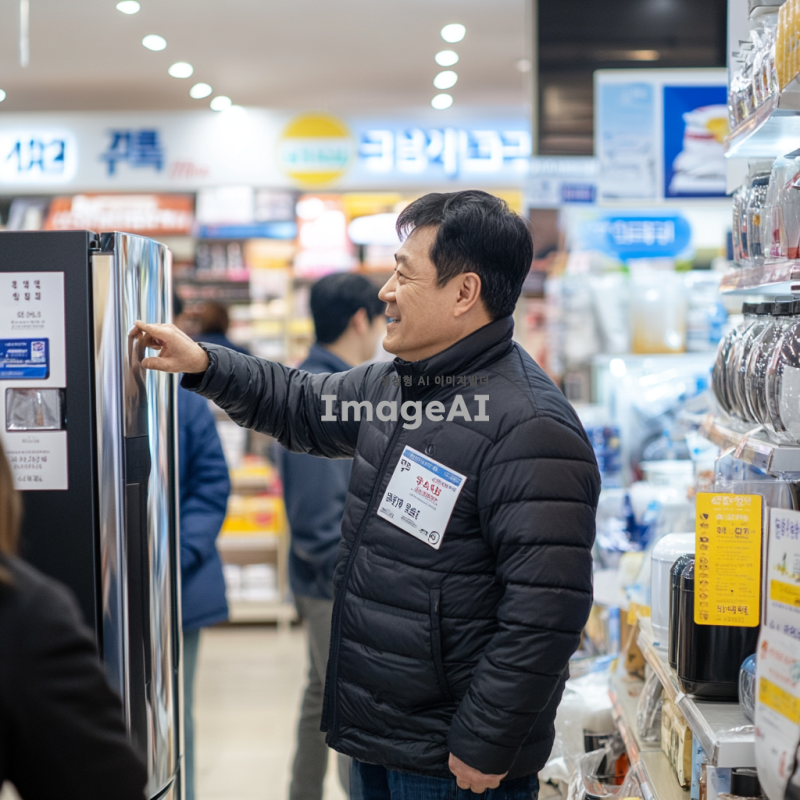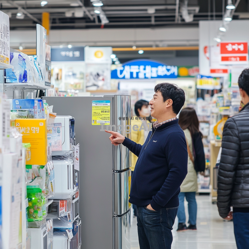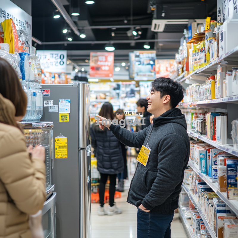 한국의 한 가전제품 매장에서 저렴한 가격에 가전제품을 구입하는 장면. 매장 내부는 밝고 아늑하며, 다양한 가전제품들이 진열되어 있다. 한 남성이 행복한 표정으로 세일 스티커가 붙은 냉장고를 바라보며 손가락으로 가격을 가리키고 있다. 주변에는 다른 고객들이 제품을 살펴보거나 직원과 상담하고 있는 모습이 보인다. 매장 벽에는 할인 행사 포스터가 붙어 있고, 바닥에는 깔끔한 타일이 깔려 있다.