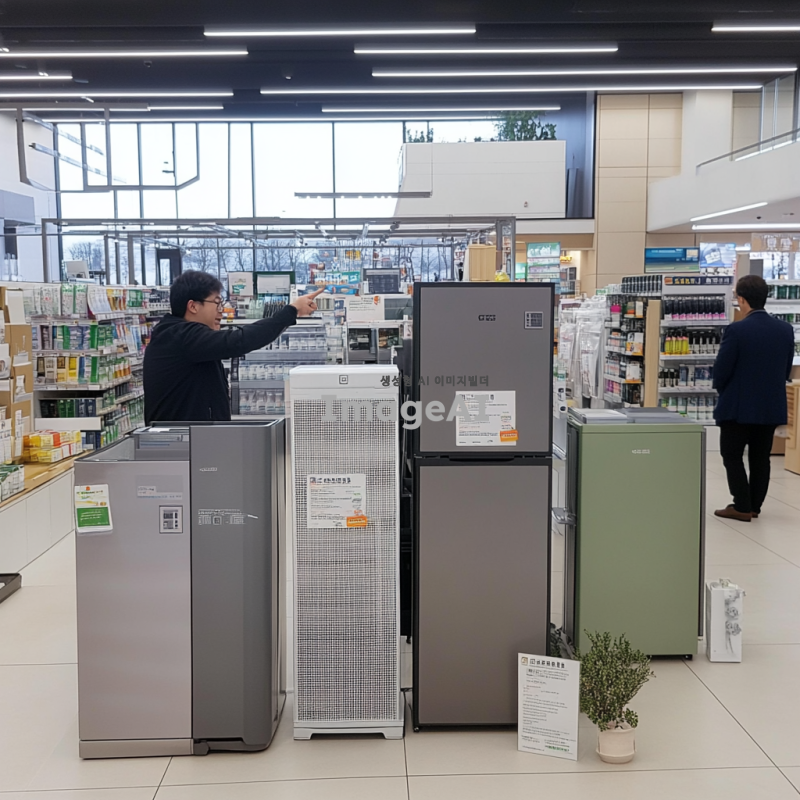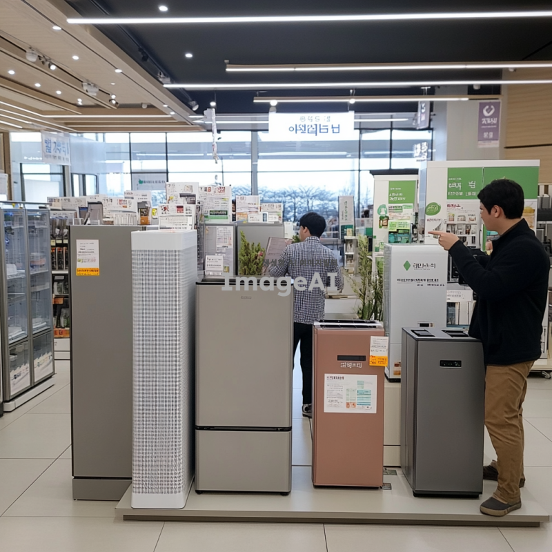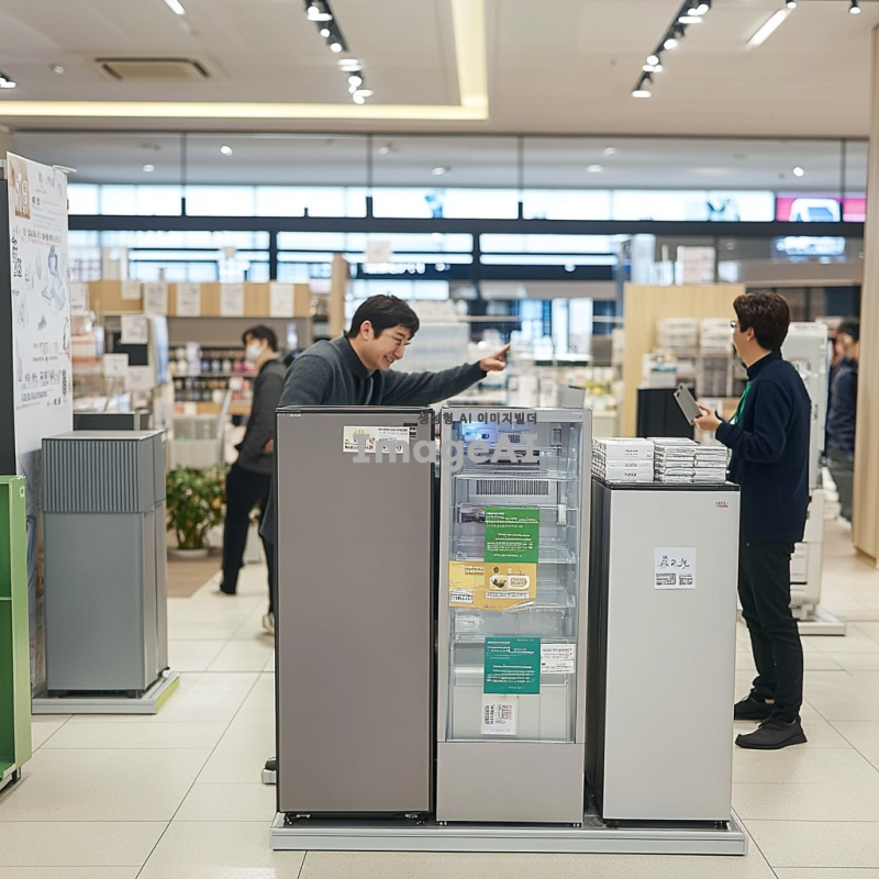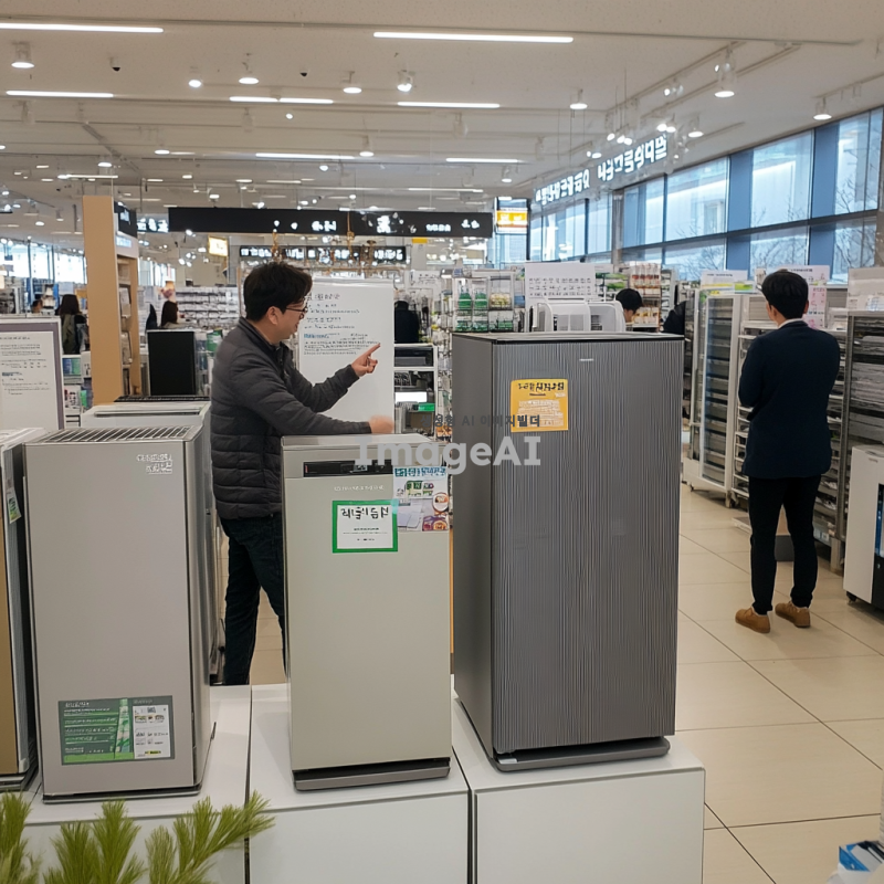 한국의 한 가전제품 매장에서 저렴한 가격에 가전제품을 구입하는 장면. 매장 내부는 밝고 아늑하며, 다양한 가전제품들이 진열되어 있다. 한 남성이 행복한 표정으로 세일 스티커가 붙은 냉장고를 바라보며 손가락으로 가격을 가리키고 있다. 주변에는 다른 고객들이 제품을 살펴보거나 직원과 상담하고 있는 모습이 보인다. 매장 벽에는 할인 행사 포스터가 붙어 있고, 바닥에는 깔끔한 타일이 깔려 있다.