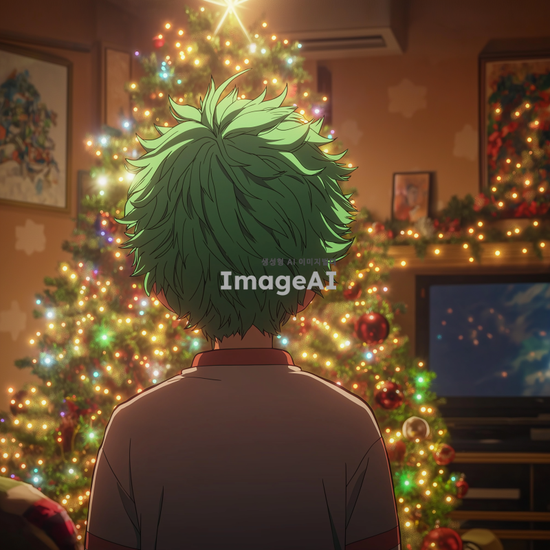 크리스마스 트리 앞에 서 있는 초록머리 소년의 뒷모습. 크리스마스 트리에는 반짝이는 전구와 화려한 장식이 가득하고, 배경에는 따뜻한 조명이 비추고 있는 아늑한 거실. 소년은 즐거운 마음으로 트리를 바라보며, 그의 초록머리는 크리스마스의 분위기와 잘 어우러짐. 일본 애니메이션