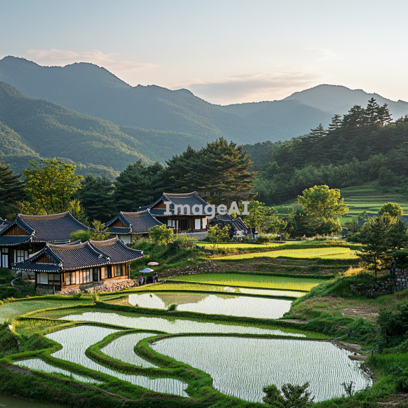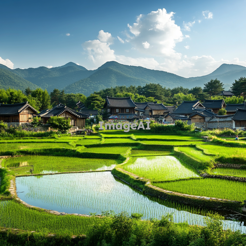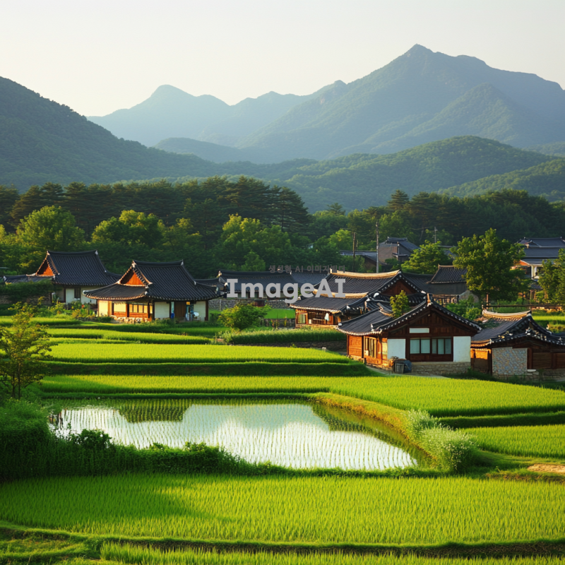 푸른 논밭이 펼쳐진 한국의 전통 마을 풍경, 햇살이 비치는 따뜻한 날씨, 논에 물이 가득 차 있어 반사되는 하늘, 마을의 고즈넉한 집들과 그 주변의 산과 나무들, 평화롭고 조용한 분위기, 농부들이 논에서 일하고 있는 모습, 전통적인 한국의 농촌 풍경을 강조하여.