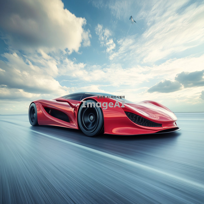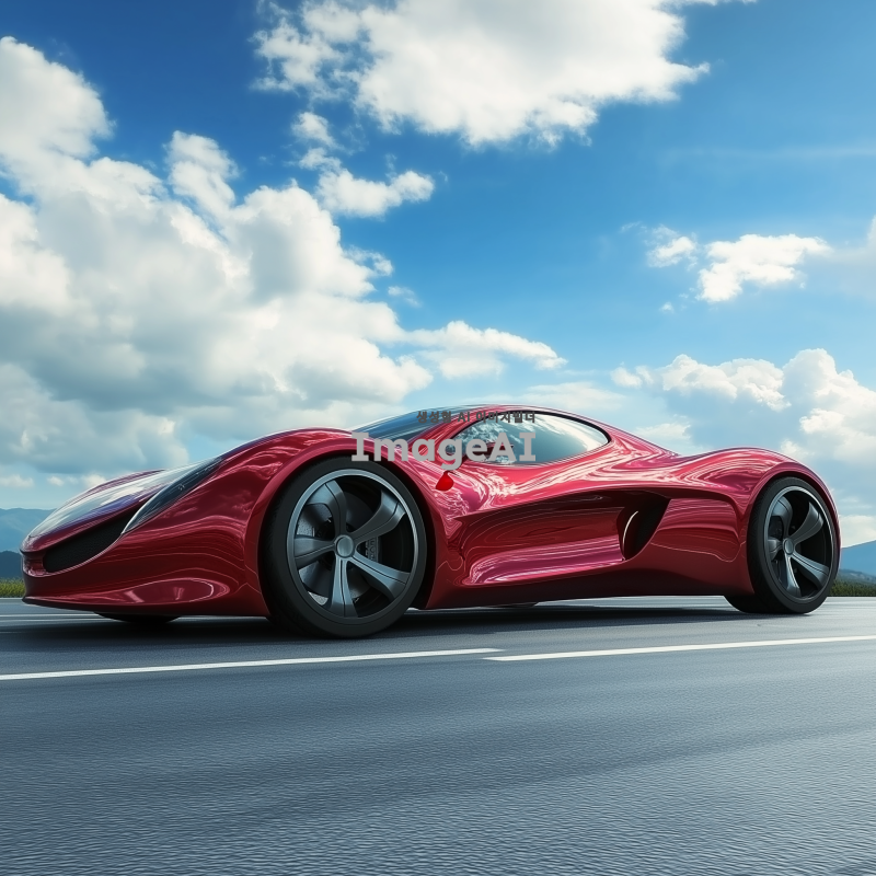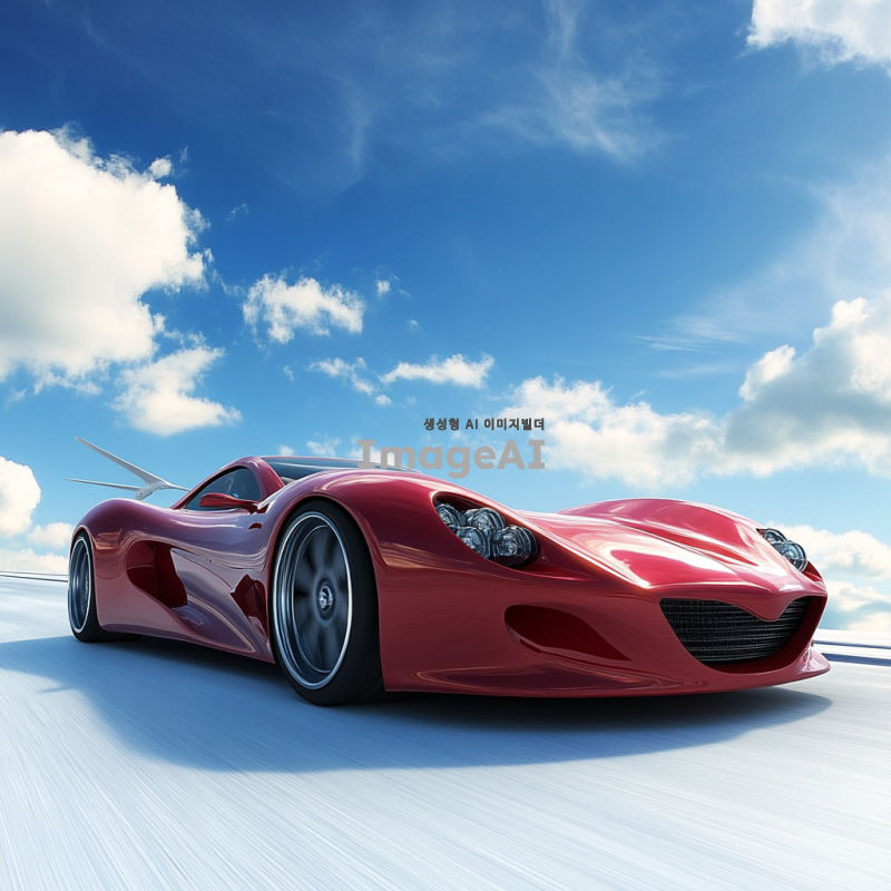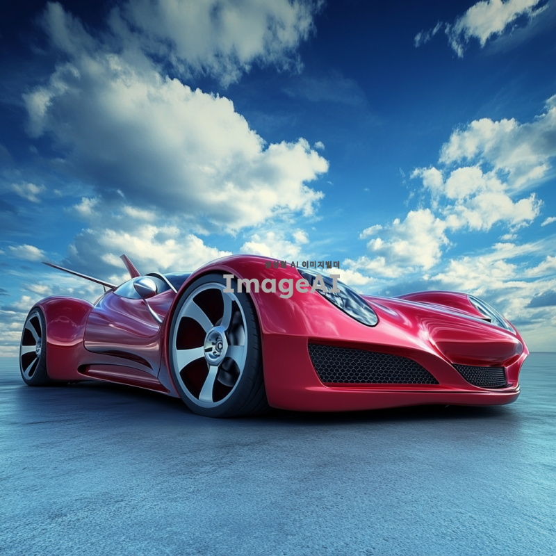 빨간색 스포츠카 디자인, 20대가 선호하는 샤프한 느낌, 풍력을 이용한 혁신적인 풍력자동차, 현대적이고 세련된 외관, 역동적인 라인과 매력적인 디테일, 청량한 하늘과 푸른 풍경 속에서 주행하는 모습.