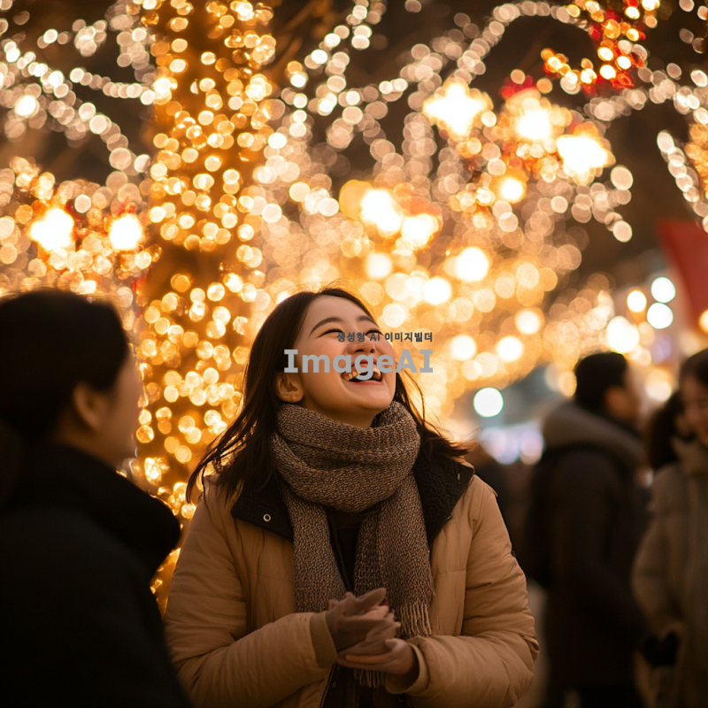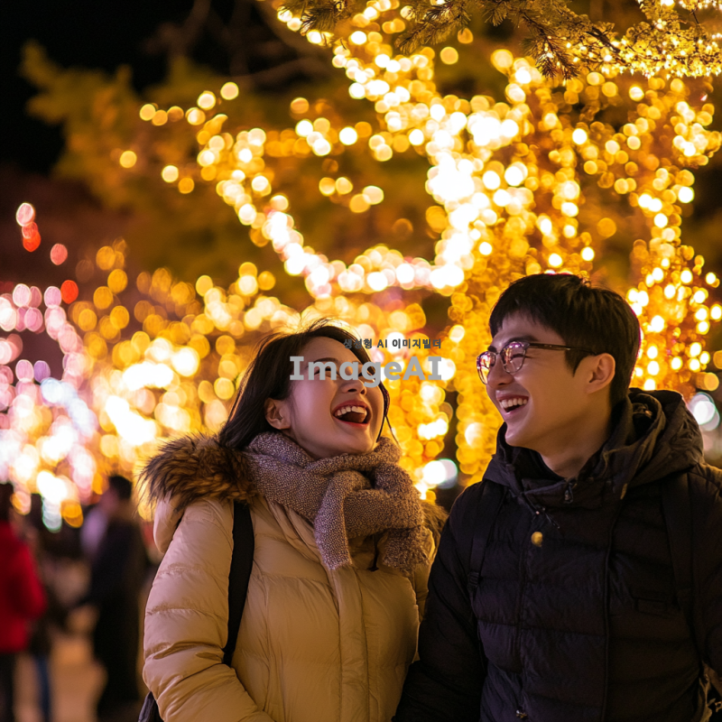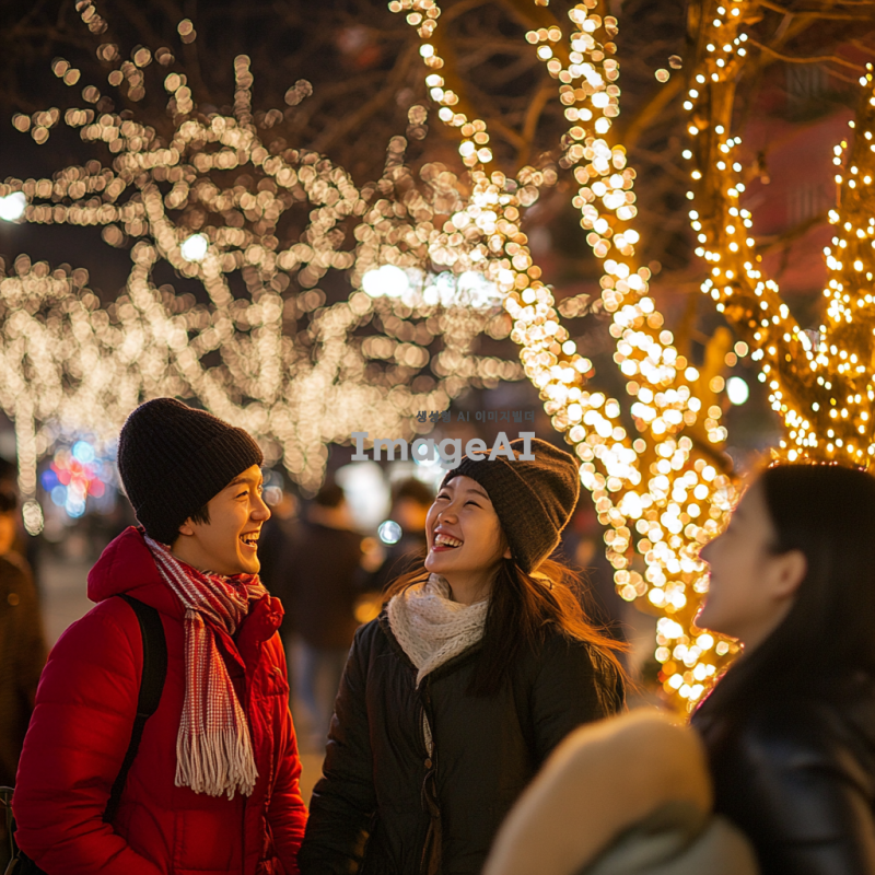 크리스마스 조명이 반짝이는 공원에서 여러 명의 한국인들이 행복하게 웃고 있는 모습. 따뜻한 겨울 분위기 속에서 소중한 순간을 즐기고 있는 사람들, 화려한 조명과 아름다운 나무가 어우러진 풍경. 가족과 친구들이 함께하는 즐거운 크리스마스의 모습.