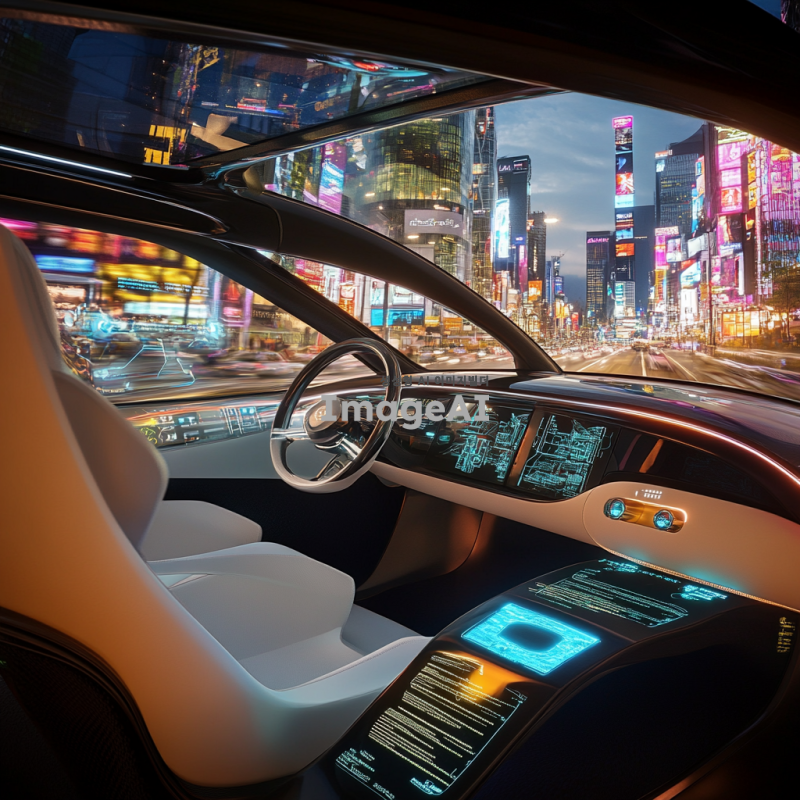 자율주행 자동차가 상용화된 미래의 모습, 운전자의 손이 자유로워진 상황에서 혁신적인 기능과 디자인을 갖춘 자동차 내부. 넓고 편안한 공간, 다양한 디지털 인터페이스와 터치스크린, 자동으로 조정되는 좌석과 조명, 운전자가 아닌 승객들이 편안하게 대화를 나누고 있는 모습. 창밖으로 보이는 미래 도시의 풍경과 함께, 자동차 외부는 매끄럽고 현대적인 디자인으로, 전기차의 특징을 살린 환경 친화적인 요소가 강조된 모습.