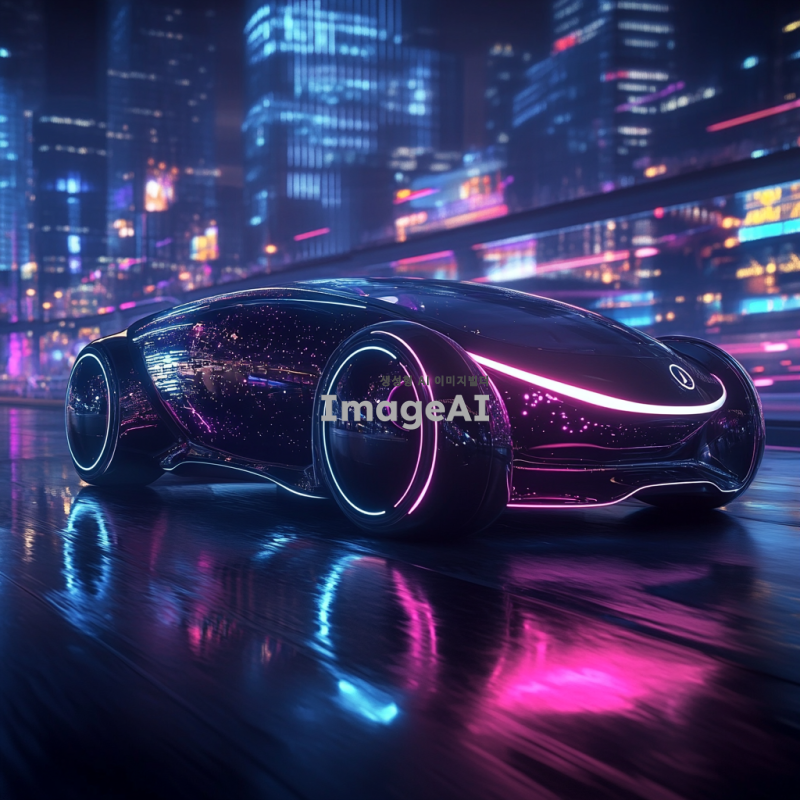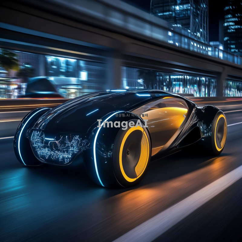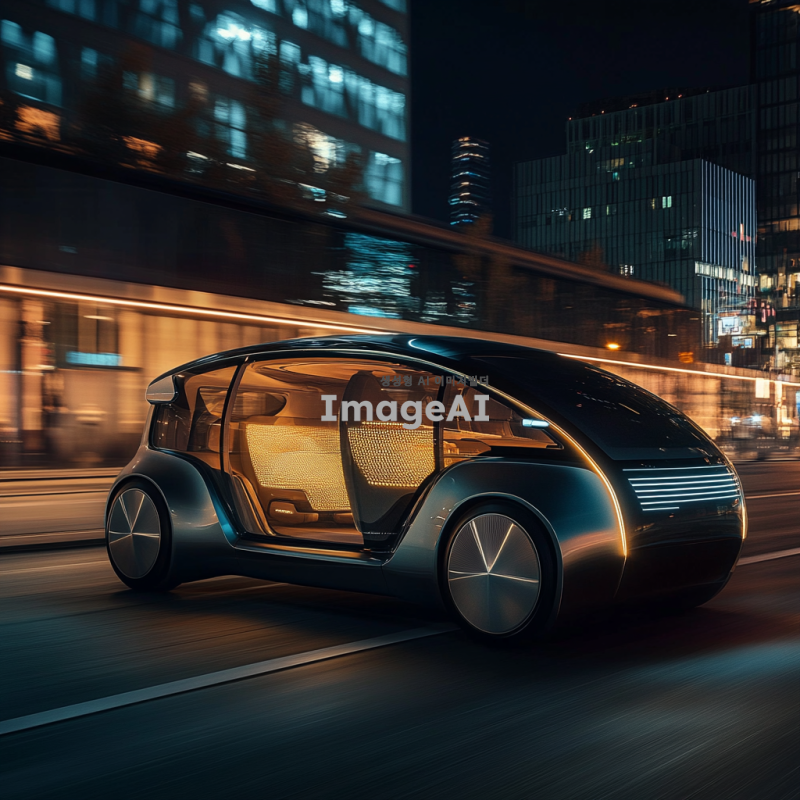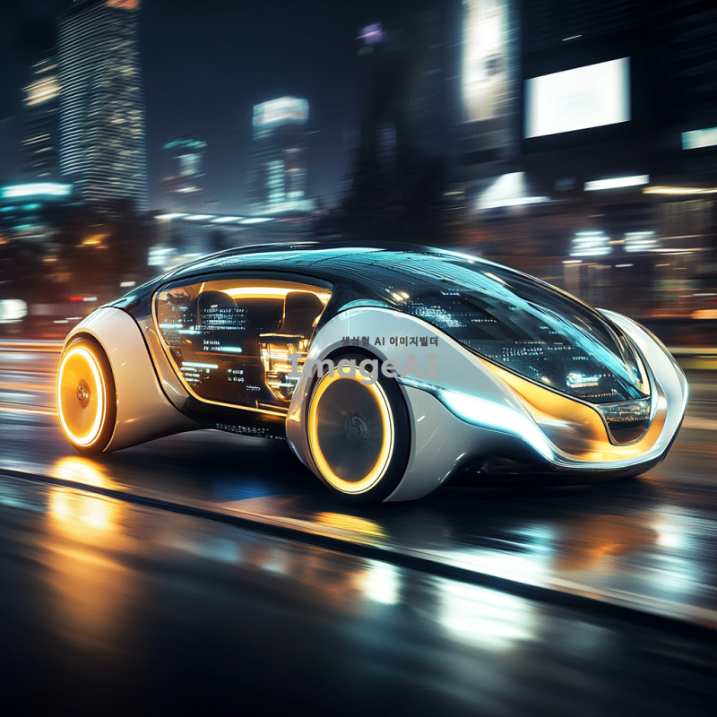 미래적인 자율주행 자동차 디자인, 혁신적인 외관과 유선형 형태, 4차 산업혁명의 핵심 기술인 인공지능과 IoT를 융합한 요소들, 20~30대의 젊은 감각을 반영한 세련된 색상과 패턴, 고급스러운 마감재와 독특한 조명 효과, 도시 배경에서 주행 중인 모습, 현대적이고 스포티한 느낌 강조.