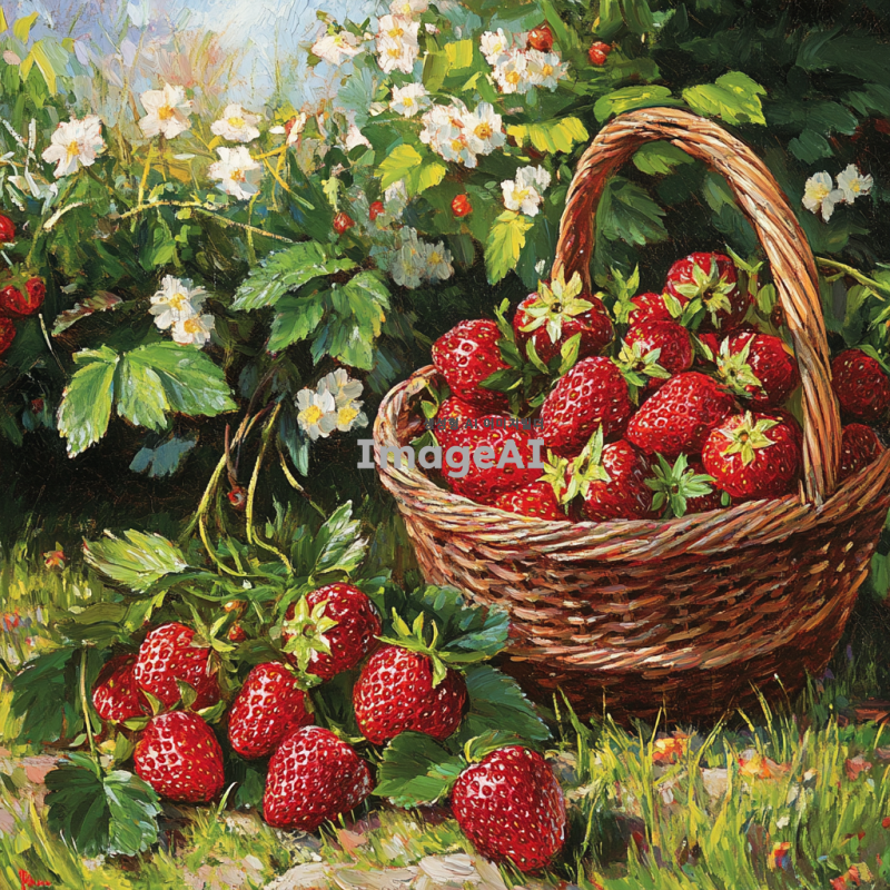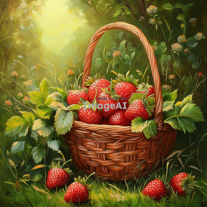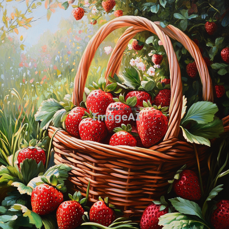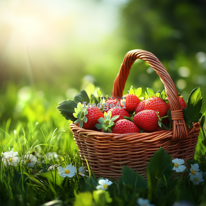 신선하고 탐스러운 딸기가 가득 담긴 바구니, 햇살 아래 반짝이는 딸기의 붉은 색감과 초록색 잎사귀가 조화를 이루는 모습, 배경에는 푸른 잔디와 꽃들이 만개한 정원, 자연의 아름다움이 느껴지는 따뜻한 분위기.