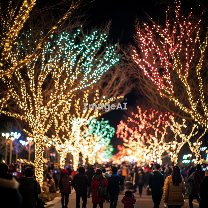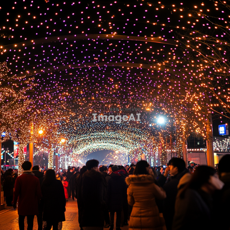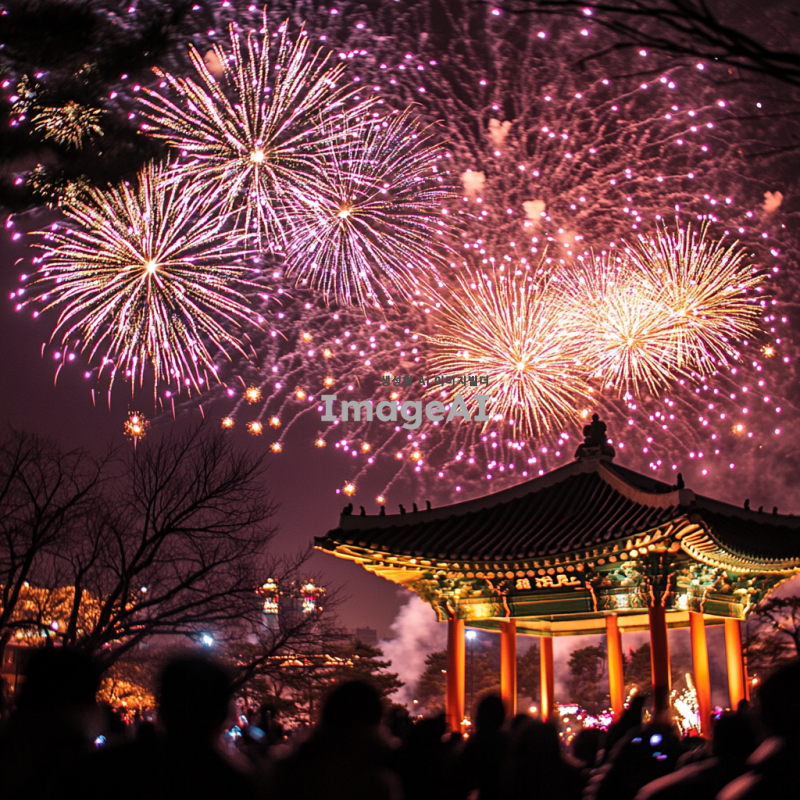 화려한 불꽃놀이 모양의 조명이 밤하늘을 밝히고 있는 장면, 다양한 색상의 불꽃이 터지는 모습, 따뜻한 분위기와 축제의 느낌이 가득한 배경, 한국의 전통 명절을 기념하는 행사, 사람들의 즐거운 표정과 함께 조명 효과가 돋보이는 이미지.