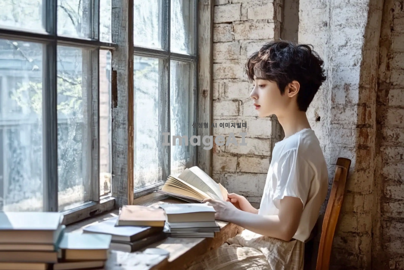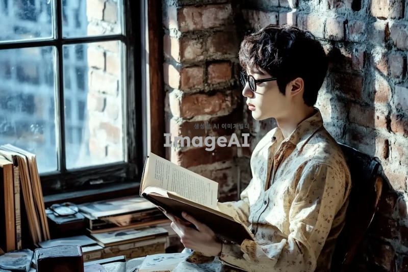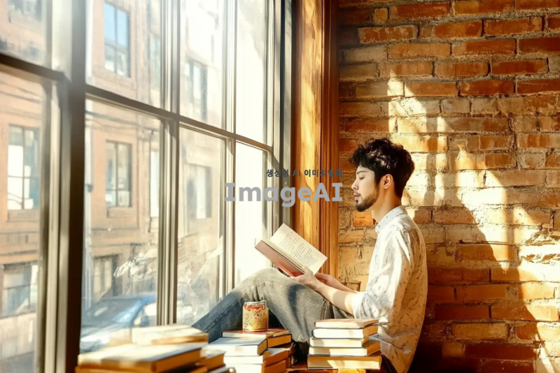 김민호라는 이름을 가진 한국 남성이 도심의 카페에서 책을 읽고 있는 모습, 따뜻한 햇살이 들어오는 창가에 앉아 있으며, 편안한 옷차림과 집중하는 표정, 주변에는 다양한 책들이 놓여 있고, 카페의 아늑한 분위기를 강조해 주세요.