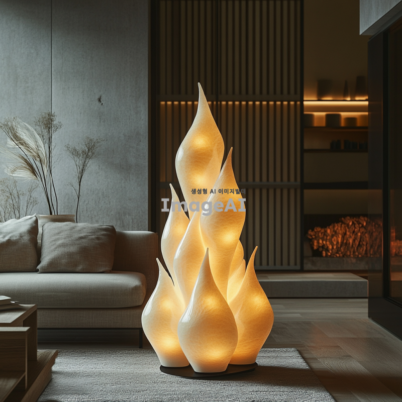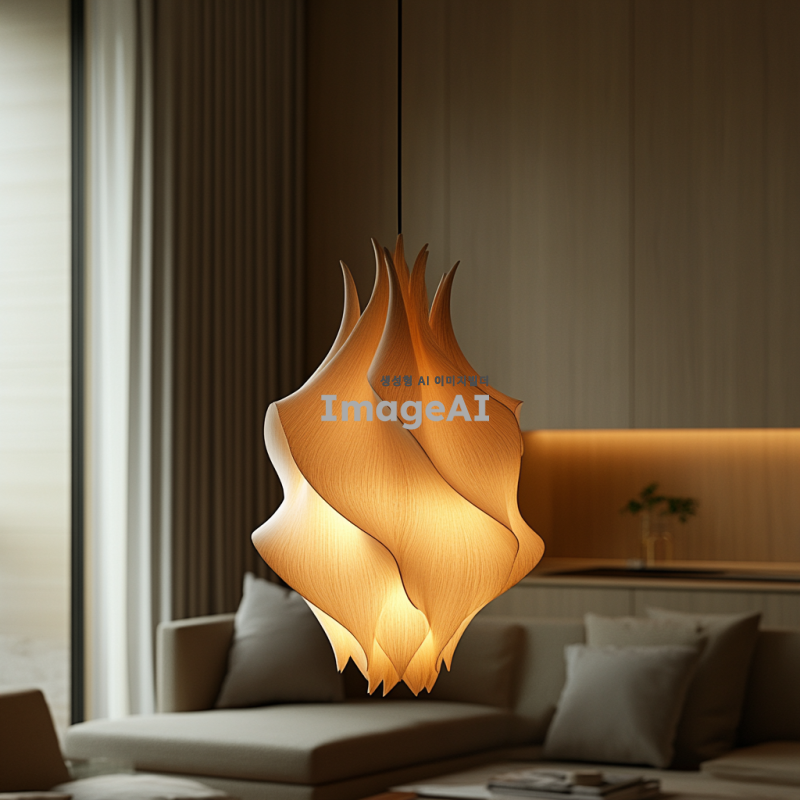 아스파라거스 모양의 독특한 조명 디자인, 자연적인 색감과 질감을 강조하며, 현대적인 인테리어에 잘 어울리는 스타일. 아스파라거스의 줄기와 잎을 형상화한 조명, 부드러운 빛이 방 안을 따뜻하게 밝히는 모습. 배경은 아늑한 거실 공간으로 설정하고, 조명이 중심에 배치된 장면.