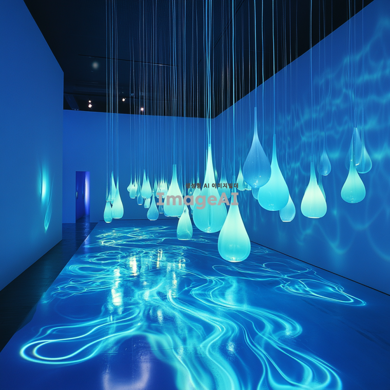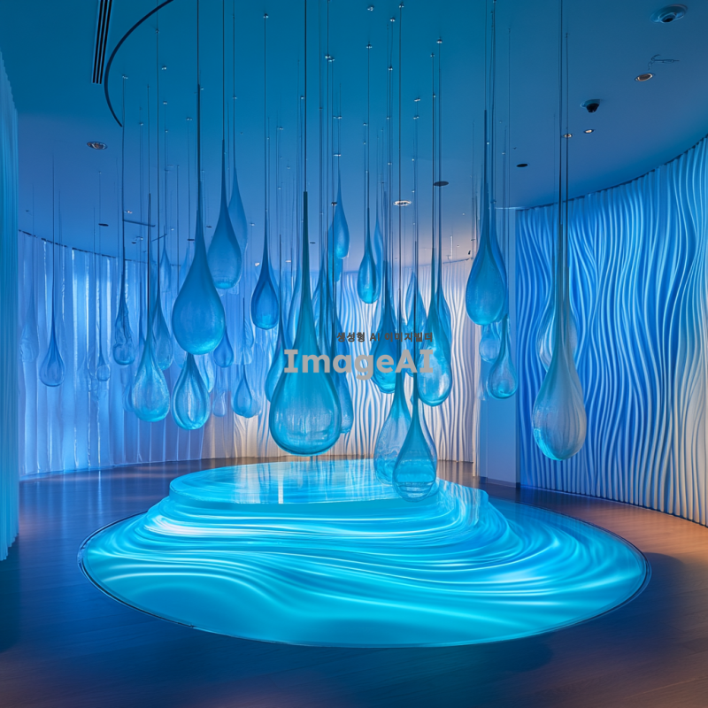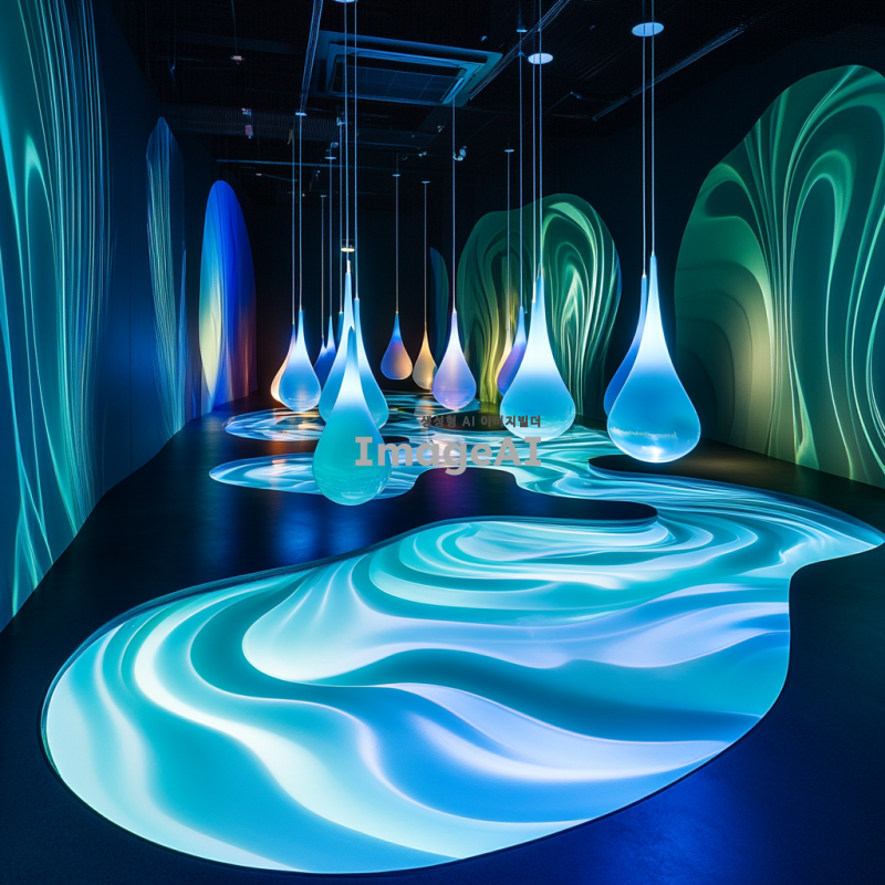 물방울 모양의 불빛이 켜져 있는 방, 방 안은 수중을 연상시키는 파란색과 초록색의 조명으로 가득 차 있으며, 벽에는 물결 무늬가 흐르고, 바닥에는 잔잔한 물결이 있는 듯한 느낌을 주는 모습, 조명에서 나오는 따뜻한 빛이 방 안을 부드럽게 감싸고 있는 장면.