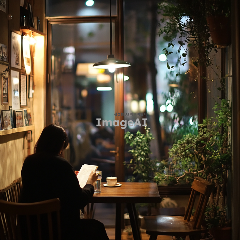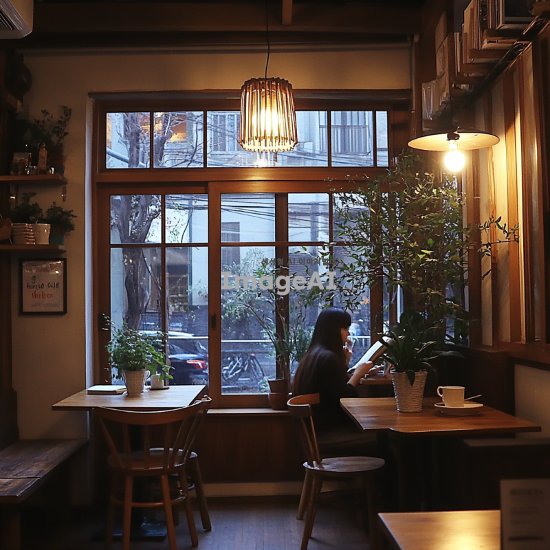 따뜻한 조명이 비추는 아늑한 카페 내부, 나무 테이블과 의자, 창가에 놓인 화분, 부드러운 색감의 인테리어, 한국인 손님이 차를 마시며 책을 읽고 있는 모습, 저녁 시간의 편안한 분위기.
