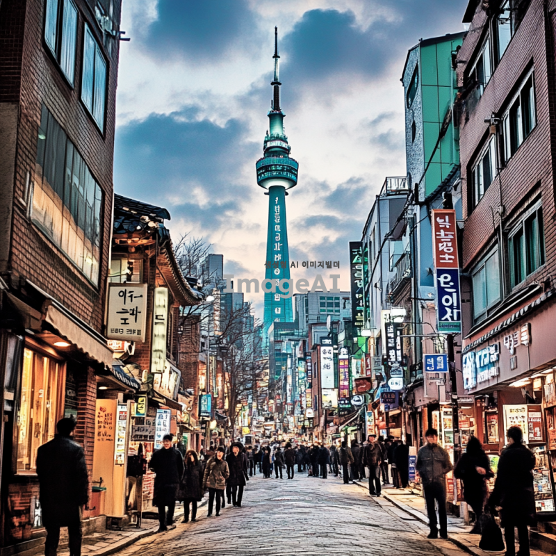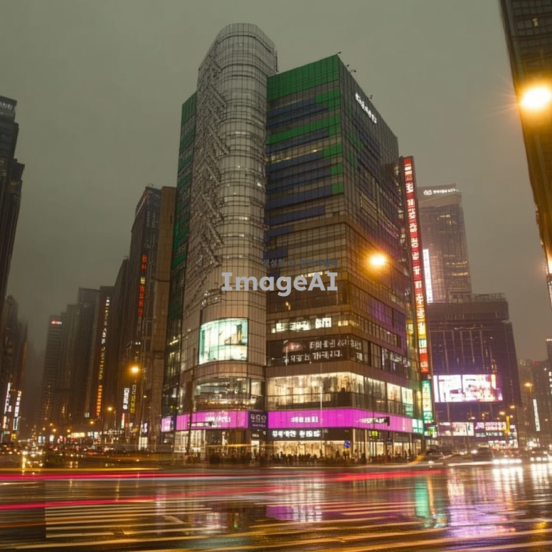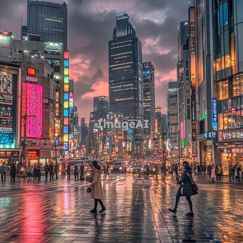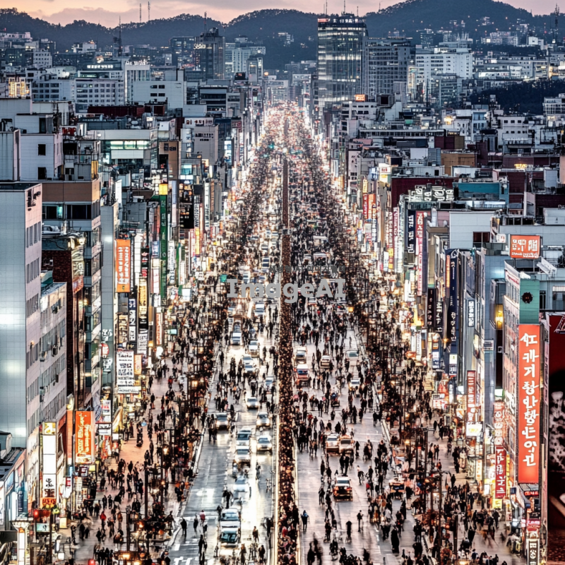 밝은 조명이 비추는 도시의 야경, 화려한 네온사인과 함께 사람들로 붐비는 거리, 고층 건물들이 하늘을 가득 채우고 있는 모습, 따뜻한 색감의 조명 아래에서 즐거운 분위기를 느낄 수 있는 장면, 한국의 전통과 현대가 어우러진 모습.