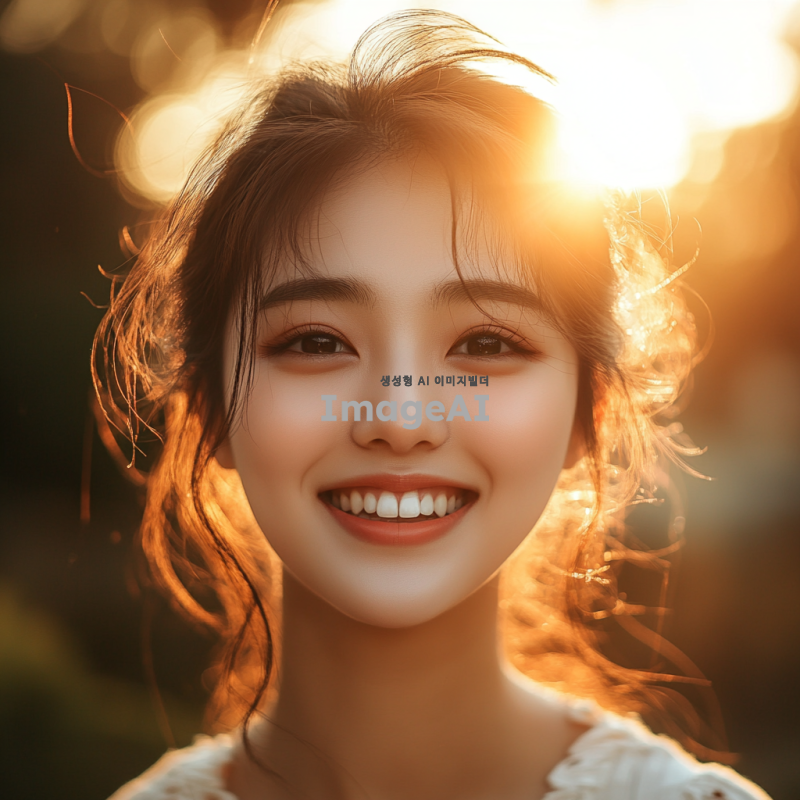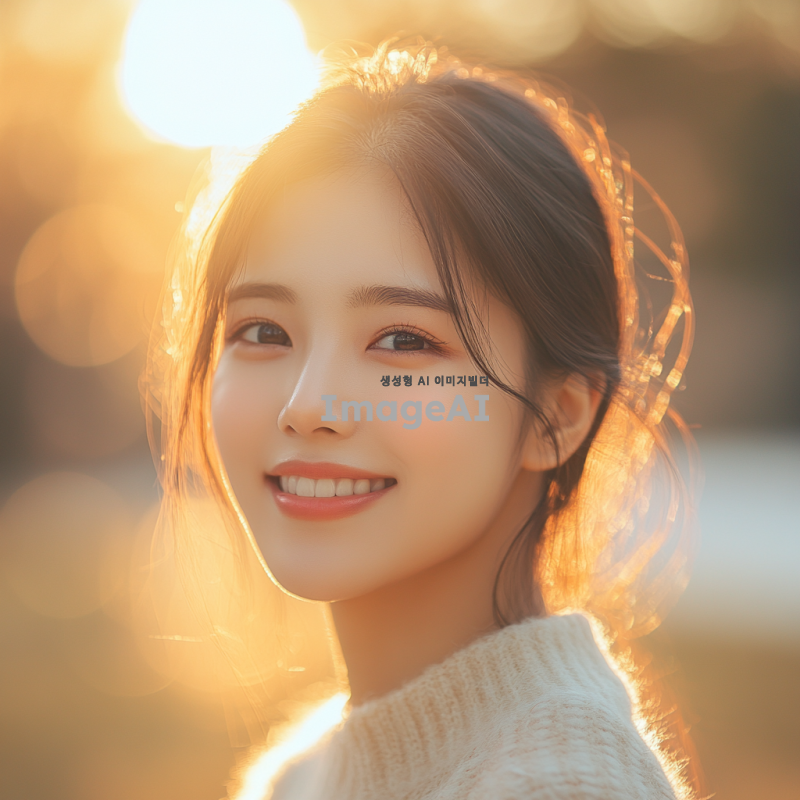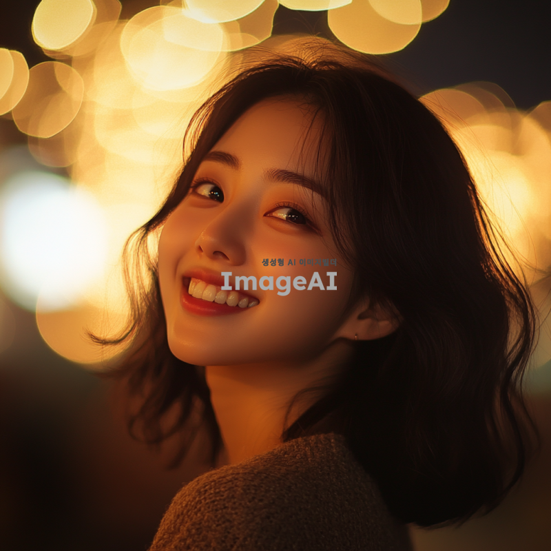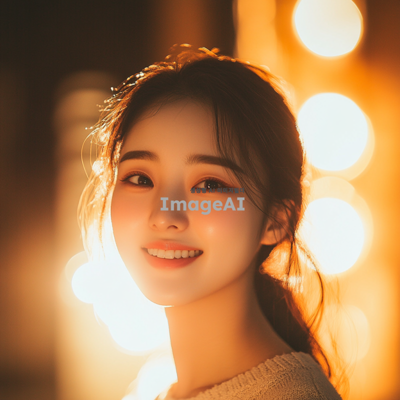 따뜻한 조명을 받으며 미소 짓고 있는 한국인 여성의 얼굴, 부드러운 피부톤과 자연스러운 메이크업, 배경은 흐릿하게 처리되어 따뜻한 느낌을 강조, 따뜻한 색조의 조명 효과가 얼굴을 부드럽게 감싸고 있는 모습.