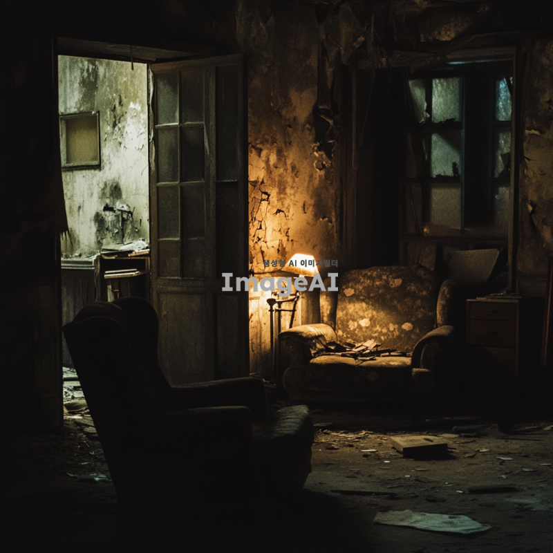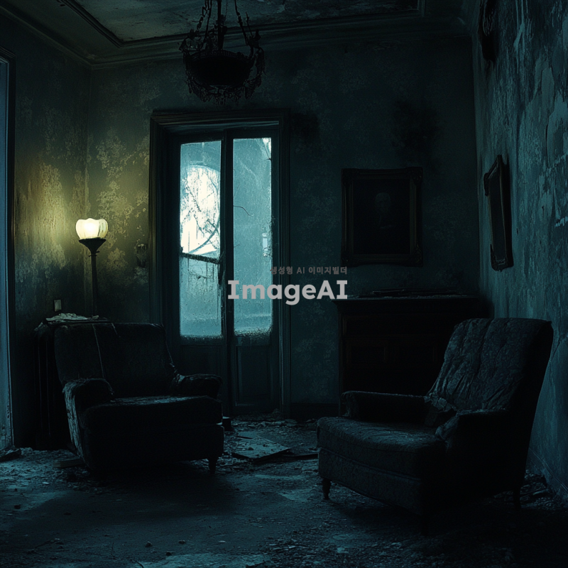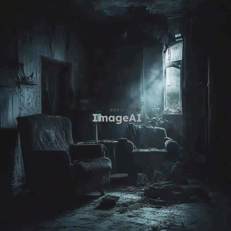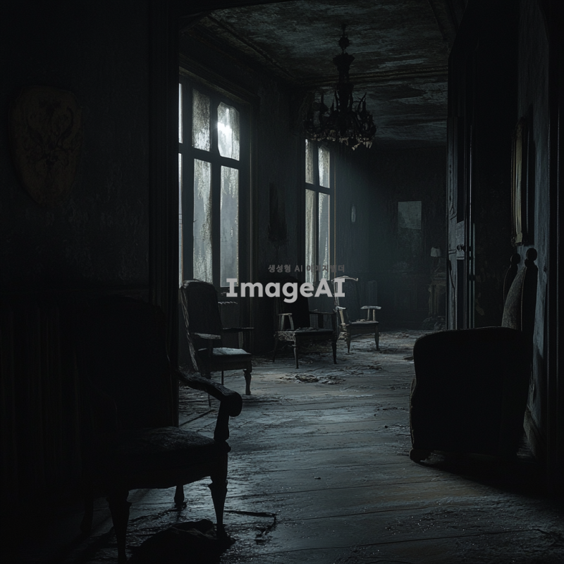 어두운 밤, 오래된 폐가의 내부 모습, 희미하게 빛나는 조명 아래 그림자들이 드리워진 공간, 먼지 쌓인 가구와 부서진 창문, 음침한 분위기의 벽과 바닥, 고요한 정적 속에서 느껴지는 불안감, 신비로운 느낌을 주는 폐허의 모습