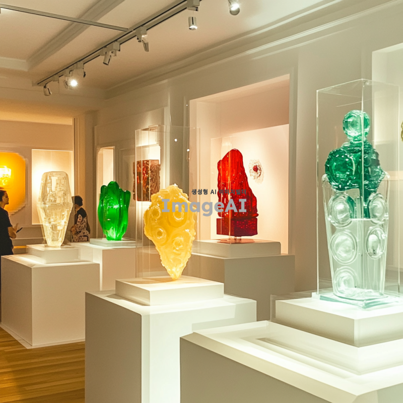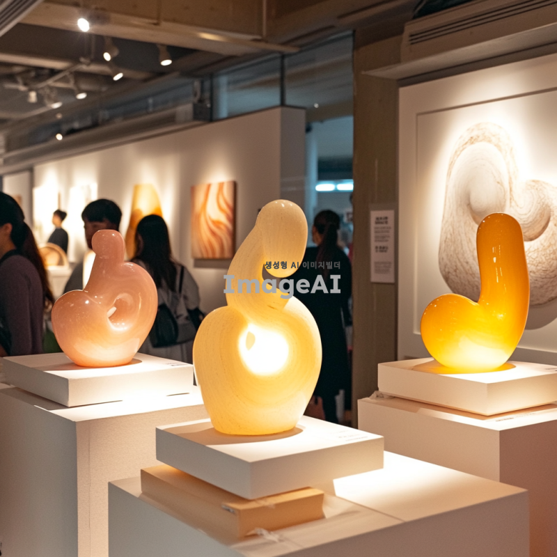 부드러운 조명이 비치는 현대적인 갤러리 공간, 다양한 색상의 조명 효과가 어우러져 있는 추상적인 예술 작품, 조명에 의해 강조된 텍스처와 형태, 관람객들이 감상하는 모습, 아늑하고 창의적인 분위기, 한국의 전통과 현대가 조화를 이루는 요소들, 예술적이고 영감을 주는 장면.