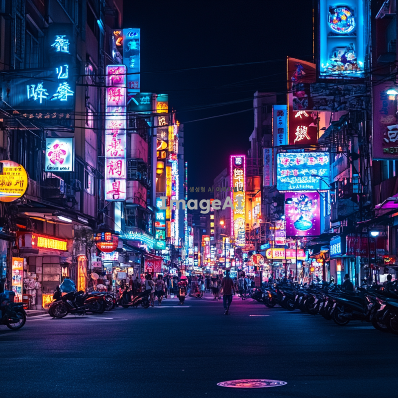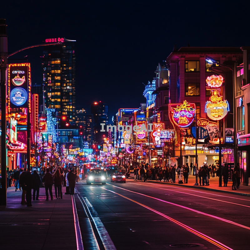 아름답고 환상적인 조명이 가득한 도시의 야경, 다양한 색상의 네온사인과 부드러운 조명들이 어우러진 풍경, 화려한 조명 아래에서 사람들과 함께 즐거운 시간을 보내는 모습, 따뜻한 분위기를 자아내는 조명 효과, 현대적인 건축물과 자연이 조화를 이루는 장면.